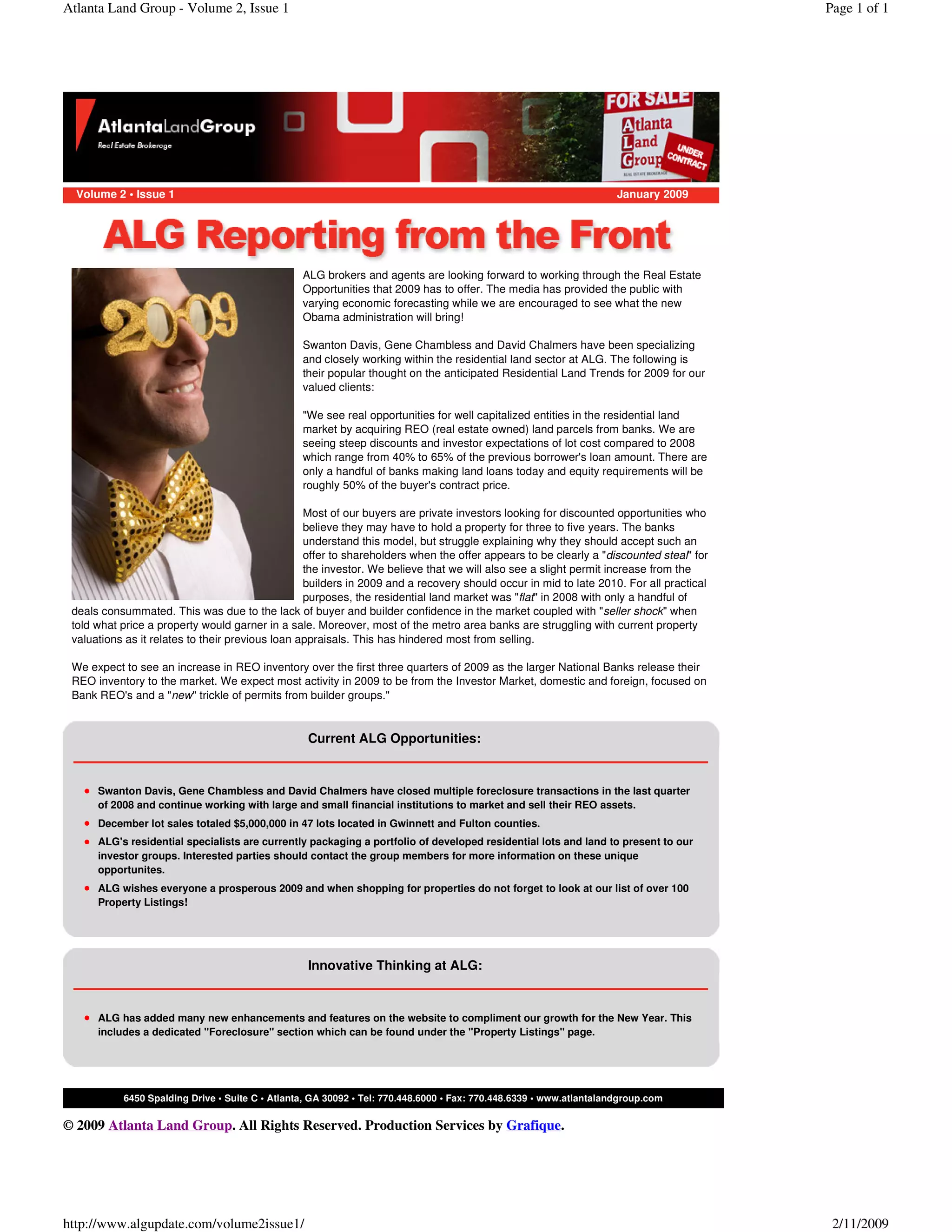 ALG brokers are looking forward to opportunities in 2009 from the residential land market. They see opportunities to acquire REO land parcels from banks at steep discounts of 40-65% of previous loan amounts. A recovery in the residential land market is anticipated in mid-late 2010. Currently, ALG specialists are packaging portfolios of developed residential lots and land to present to investor groups.