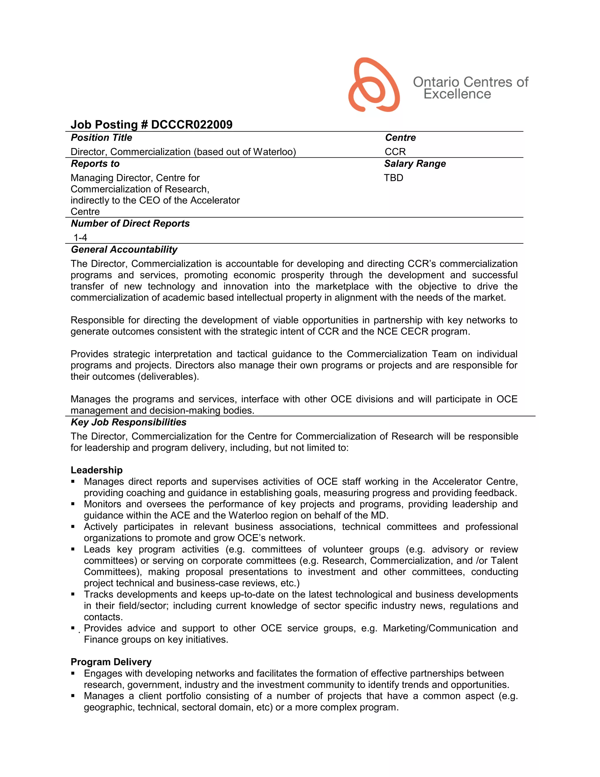 This job posting is for a Director of Commercialization based out of Waterloo to lead programs and services that promote the commercialization of academic research. The position reports to the Managing Director of the Centre for Commercialization of Research and is responsible for managing staff, monitoring projects, engaging networks, and facilitating partnerships between academia and industry. Duties include overseeing workshops, establishing early-stage commercialization connections, and identifying trends and opportunities. A Bachelor's degree, 10 years of experience, and skills in project management, analysis, and communication are required.