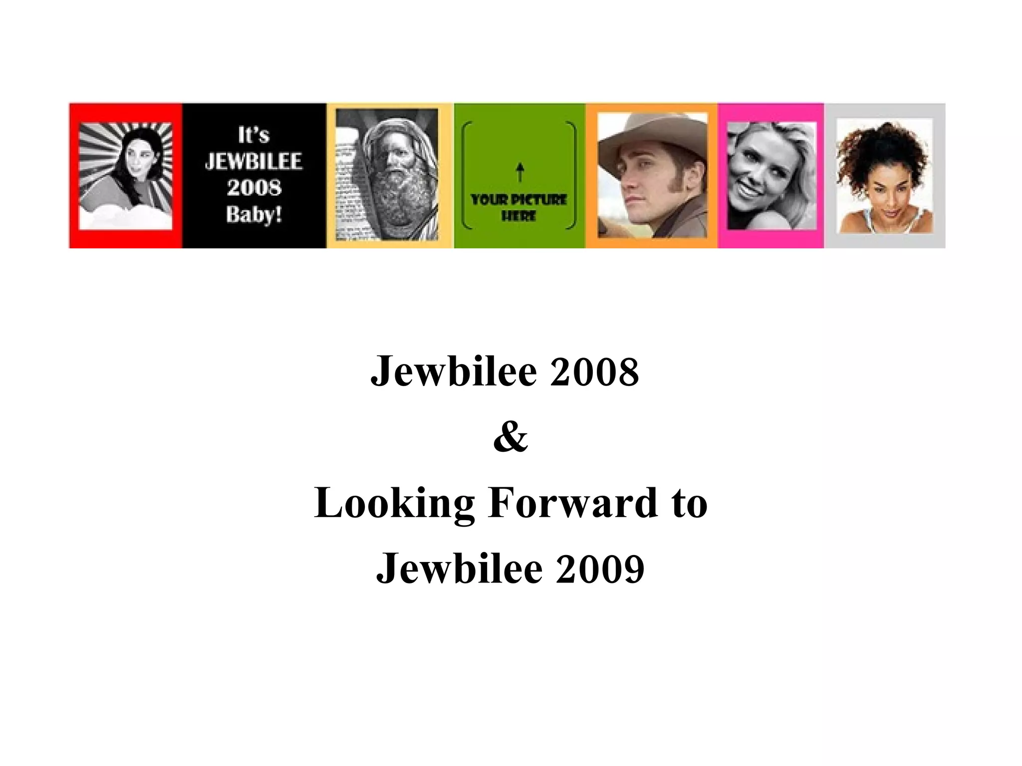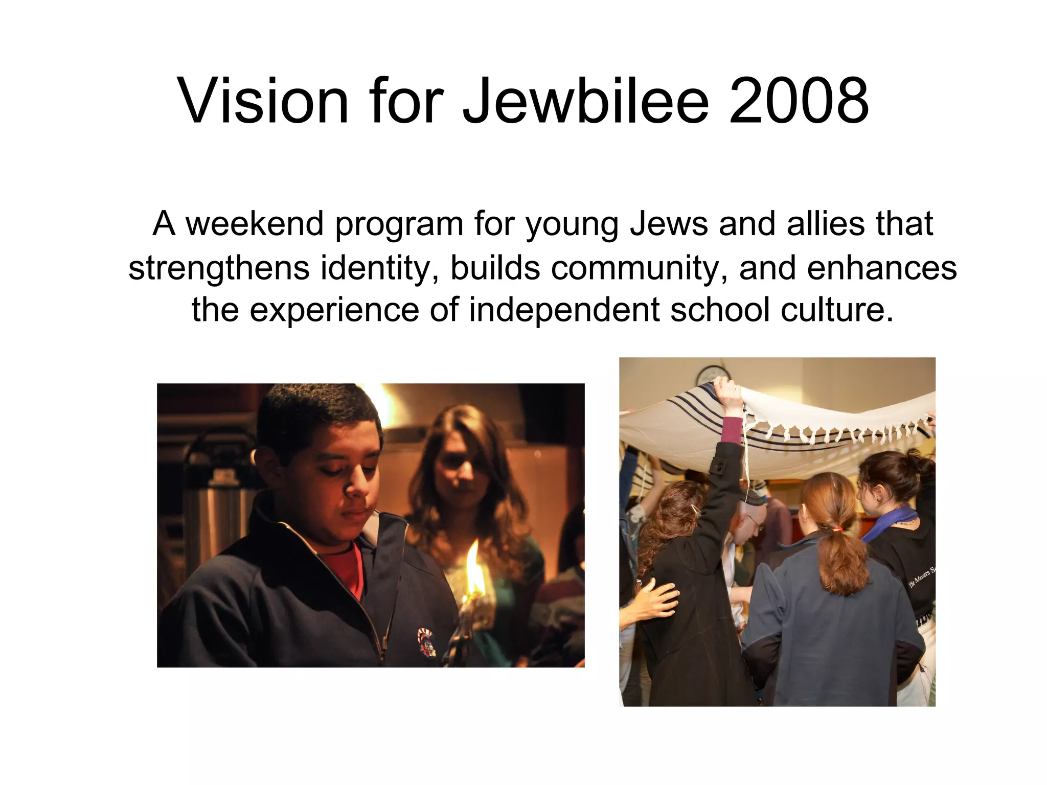 The document summarizes Jewbilee 2008, a program for young Jews and allies at independent schools, and looks ahead to Jewbilee 2009. It describes the goals and successes of Jewbilee 2008 in strengthening identity, building community, and enhancing independent school culture. For 2009, the program will change its name to "The Retreat formerly known as Jewbilee" and relocate to Harvard University, featuring Shabbat meals and services, multi-tiered Jewish learning tracks, and activities for students to envision future Jewish identity.