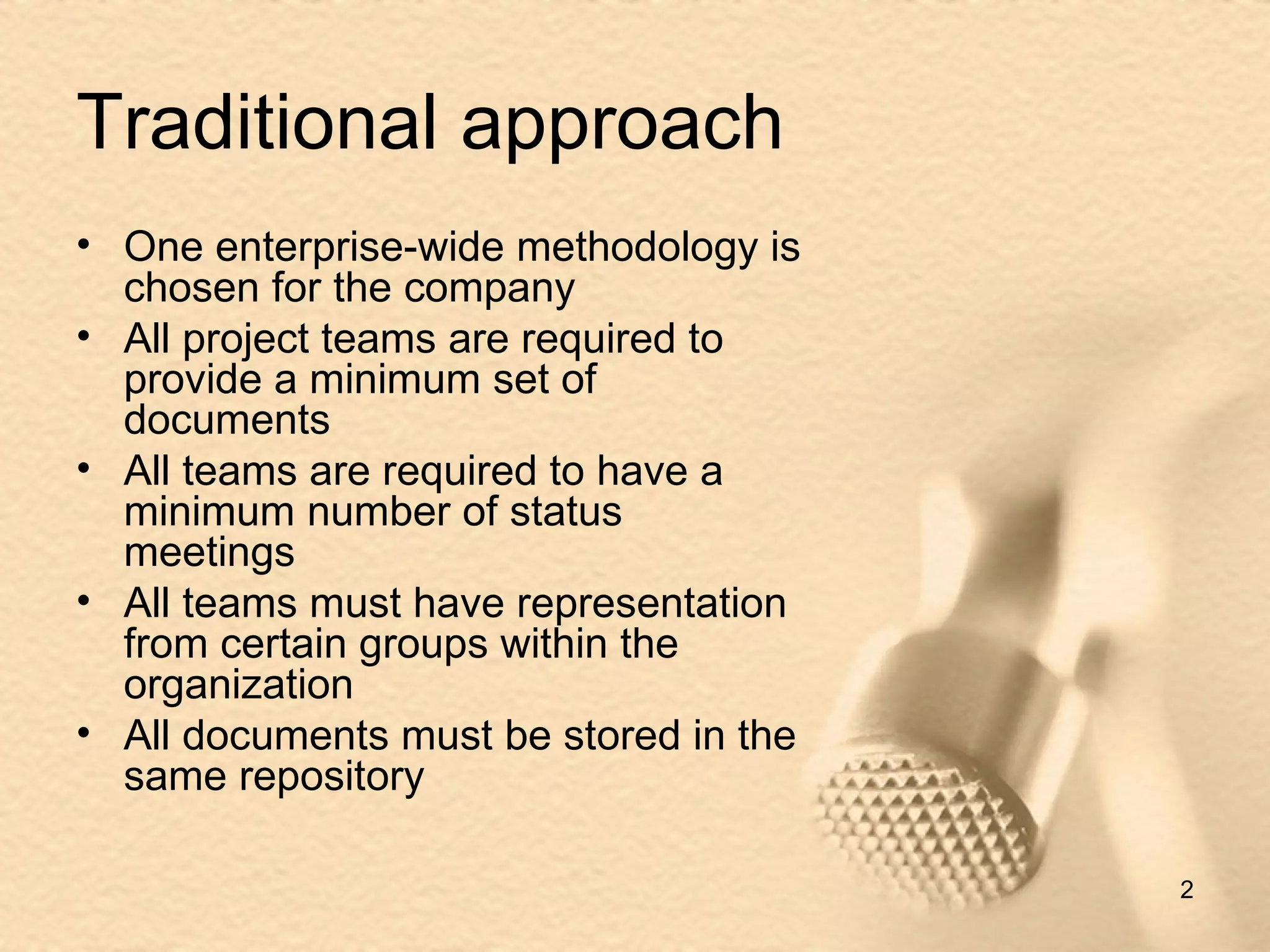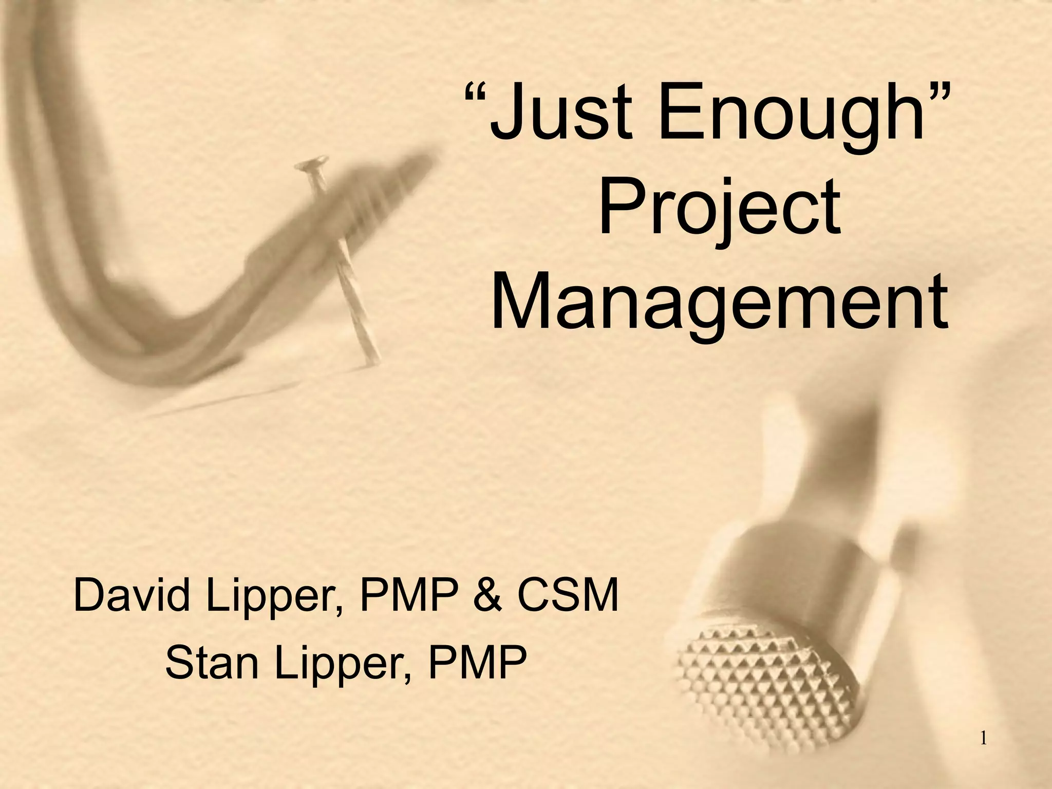 The document discusses the "Just Enough" approach to project management, which advocates selecting the methodology that best fits each individual project rather than imposing a single standardized methodology across all projects. It argues that a one-size-fits-all approach does not work because projects differ in their goals, requirements, and environments. The "Just Enough" approach involves right-sizing the methodology, tools, and documentation for each project based on its specific needs rather than enforcing blanket rules.
