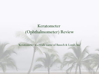 A keratometer is an instrument that measures the curvature of the cornea to detect and quantify astigmatism. It provides measurements of the flattest and steepest meridians of the cornea in diopters. Manual keratometry is preferred for certain patients and when performing toric IOL calculations, while corneal topography can provide additional information about the anterior corneal surface. Proper use and calibration of the keratometer is important for obtaining accurate measurements.