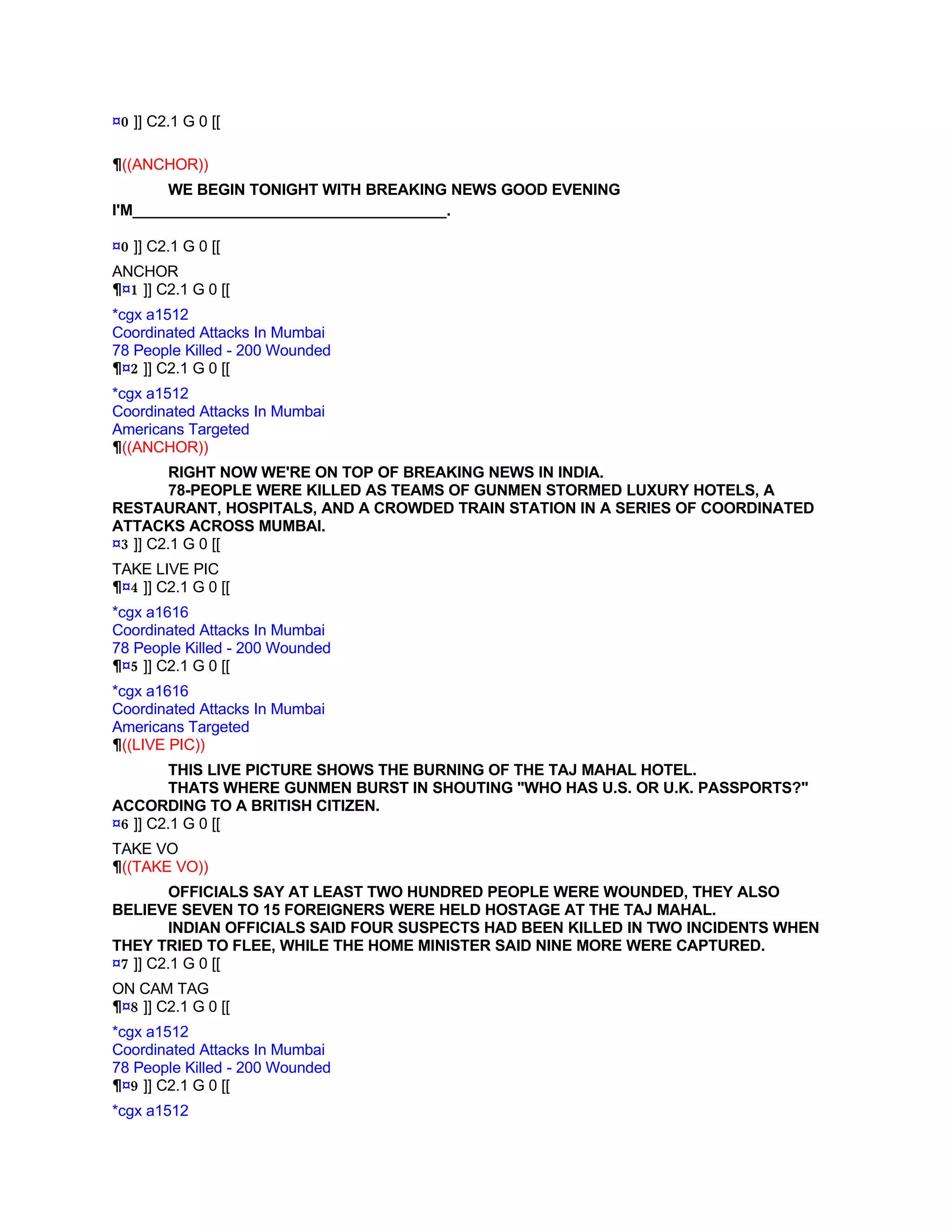 Coordinated terrorist attacks in Mumbai, India killed 78 people and wounded 200. Gunmen stormed luxury hotels, restaurants, hospitals and a train station. Americans and Westerners were specifically targeted. In New York, the FBI received a report that al-Qaeda may be discussing plans to attack the city's subway system. Heavy travel and bad weather across the US caused major delays for air travelers returning home after Thanksgiving.