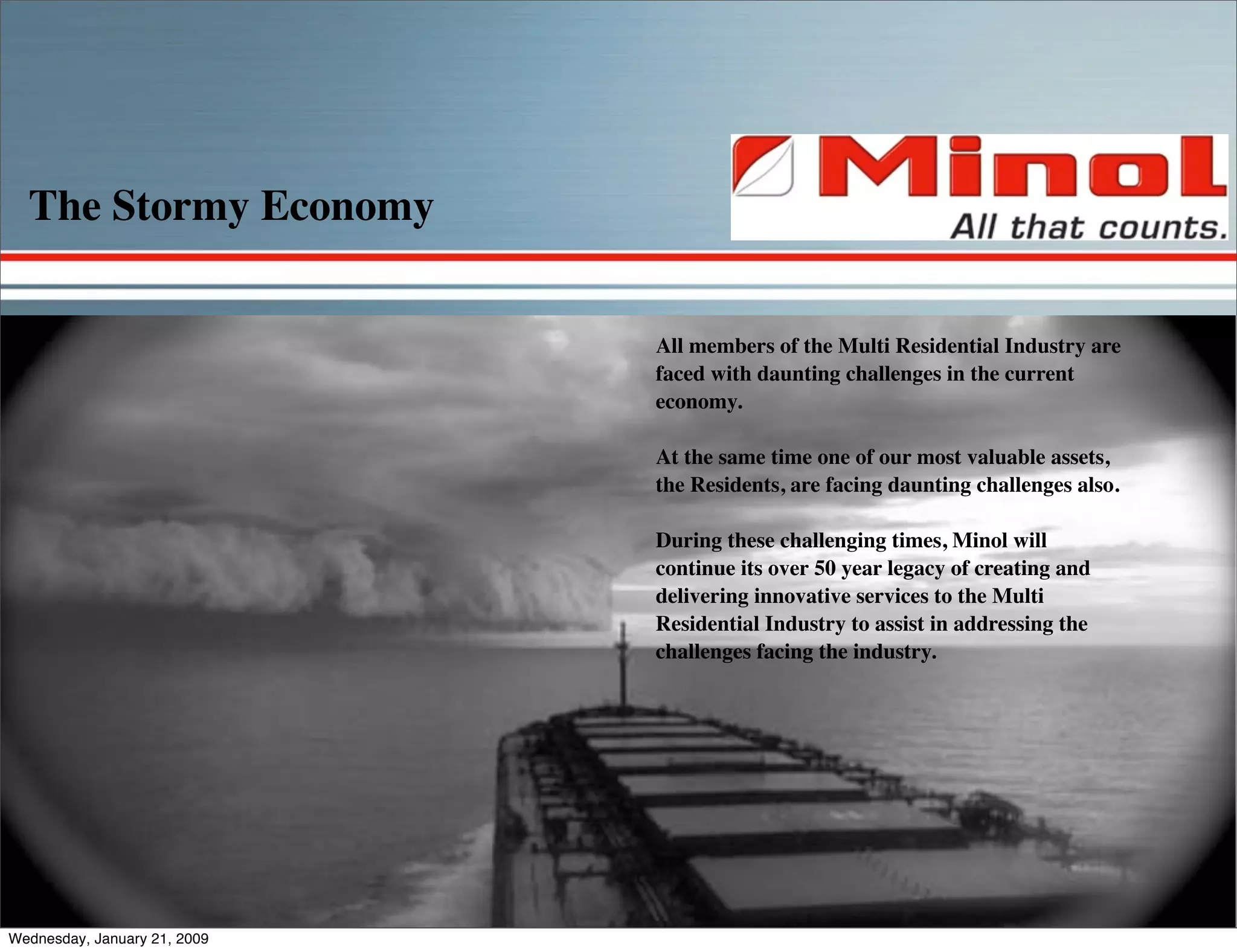 The document discusses how the economic downturn has led more people to stay home instead of going out, impacting various industries. It then discusses how media companies and producers may need to adapt entertainment offerings to reach this "stay at home" audience online, on TVs and phones. Finally, it summarizes how the company Minol Connect offers bundled voice, video and data services for multi-family communities to capitalize on this trend.
