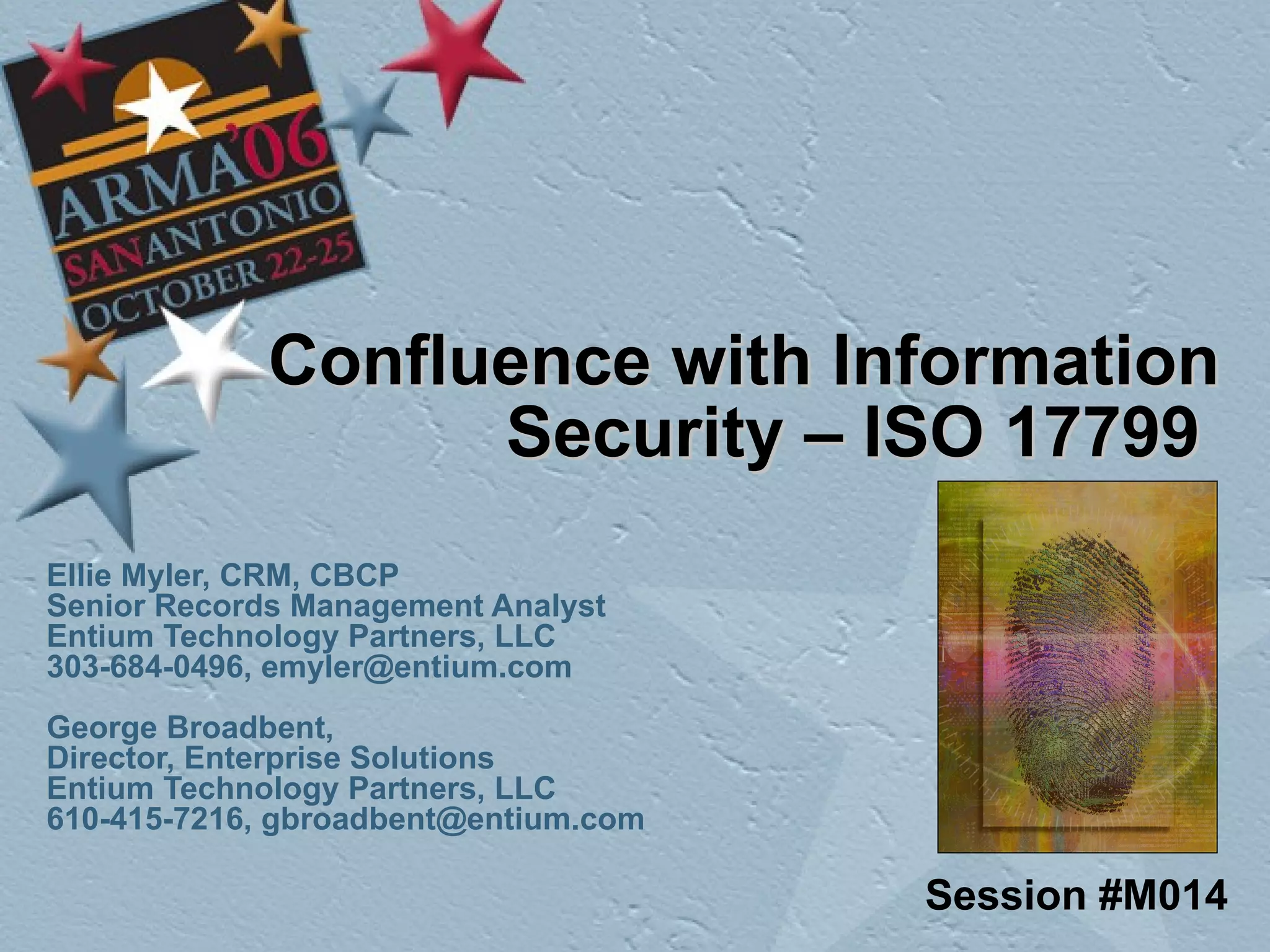 The document outlines a session focused on ISO 17799 and its implications for information security and records management. Key topics include the importance of establishing security policies, managing risks, handling security breaches, and aligning records management with information security objectives. It also emphasizes compliance with various regulations and standards to protect personal and sensitive information.