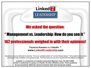 Management involves planning, organizing resources, and ensuring efficiency to achieve goals, while leadership involves inspiring and influencing others through vision and character to drive change and fulfill a vision. Effective organizations value both management and leadership skills, and the best leaders and managers understand how to work together to maximize success.