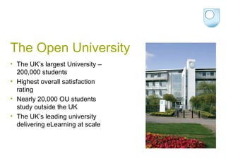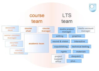 The document discusses managing change in educational media production at The Open University. The Open University has transitioned from primarily physical learning materials to online learning, requiring changes to production systems and roles. This includes breaking down silos between departments, outsourcing routine tasks, and focusing on high quality learning experiences. Managing change effectively requires a clear strategic aim, teamwork, building new skills on existing expertise, and ensuring employees can help shape ongoing changes.