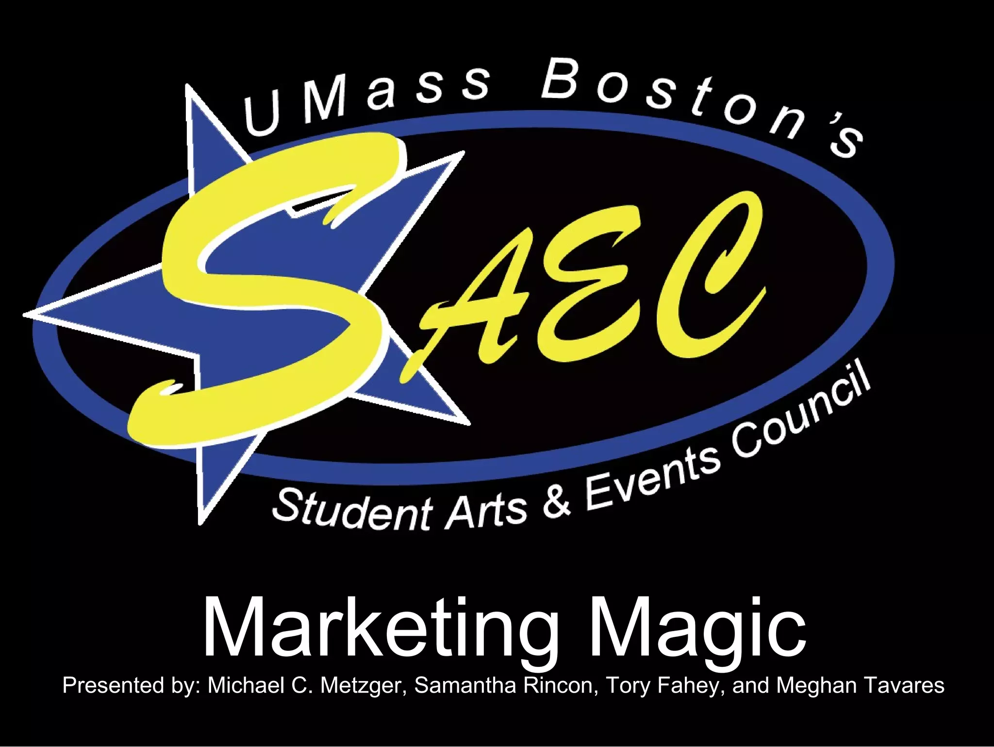 The presentation outlines a marketing strategy aimed at engaging students at the University of Massachusetts Boston, focusing on branding and effective communication. By applying marketing theories, the goals are to create a recognizable identity for the student organization, deliver impactful messages, and employ creative tactics to attract attention. Key steps discussed include developing a consistent brand message, designing a logo, and creating engaging taglines while implementing great poster design principles.