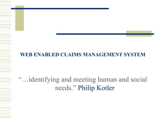 The document discusses a web-enabled claims management system called WCMS being developed by AMTPL to target the insurance market in Middle East and India. WCMS allows online claims processing and management. It has features like storing member details, policies, eligibility details, coverage details etc. on smart cards. AMTPL plans to outsource the system to insurance companies and providers to help them improve efficiency.