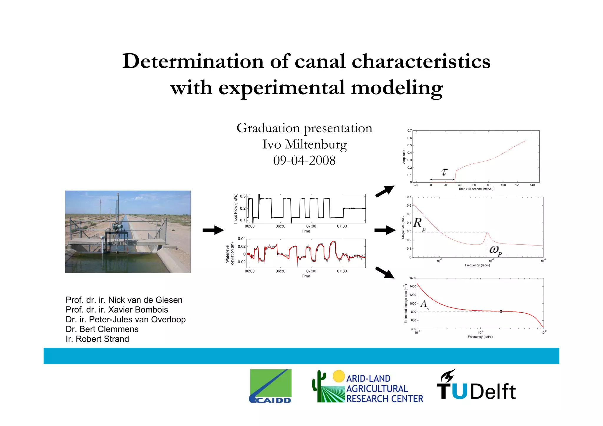 The document details a research presentation on the determination of canal characteristics through experimental modeling, focusing on irrigation canal systems and their operational management. It highlights the importance of resonance behavior and control mechanisms in optimizing water flow and canal efficiency. The conclusions include the significance of conducting experiments to better understand canal dynamics and improve control strategies.