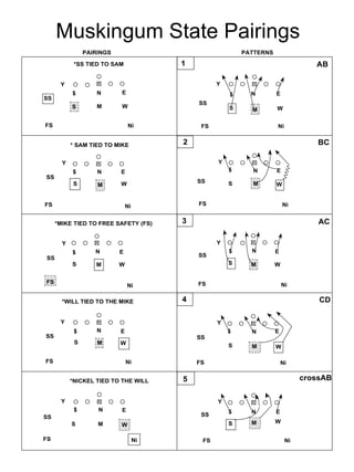 This document outlines Muskingum College's defensive playbook and strategies. It discusses their "Muskingum Way" package and pairings against different offensive formations. It provides instructions for edge players, inside players, blitzers, and defensive linemen based on the offensive pressure and patterns. It also mentions their use of zone coverage and lists contact information for the assistant head coach and defensive coordinator.