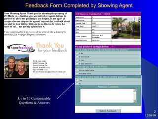 The document outlines a feedback system for home sellers provided by homefeedback.com, which includes customizable questions and answers, and a notification system for feedback received. Sellers can monitor their feedback and marketing efforts via a private control page available 24/7. The service promises to enhance the selling process by keeping sellers informed and potentially increasing the sale price of their homes.