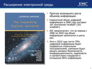 Документ описывает тенденции на рынке управления электронными документами, прогнозируя значительный рост объемов цифровой информации до 2010 года. Подчеркивается необходимость создания настоящих систем электронного документооборота, которые могут эффективно управлять всеми документами на протяжении всего их жизненного цикла. Вводится концепция общих сервисов ECM, которые обеспечивают централизованное управление и интеграцию с другими информационными системами для повышения эффективности и снижения затрат.