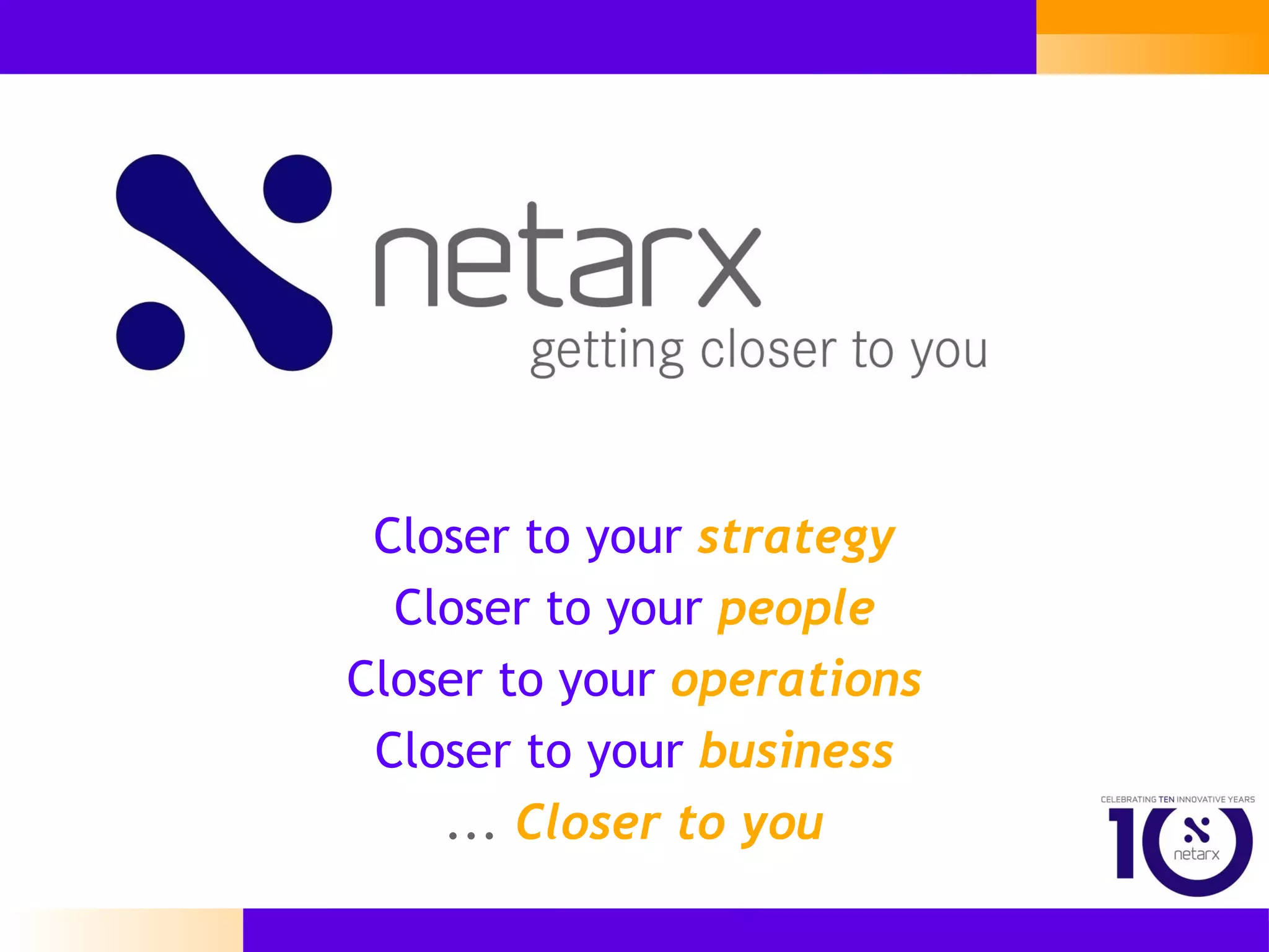 Netarx is a business technology company that designs, builds, manages and optimizes customized network communication solutions tailored to clients' business goals and objectives. They combine advanced IP technologies and services to deliver solutions that help clients achieve their goals. Netarx takes a holistic approach by understanding clients' businesses and architecting technology roadmaps that meet specific objectives.