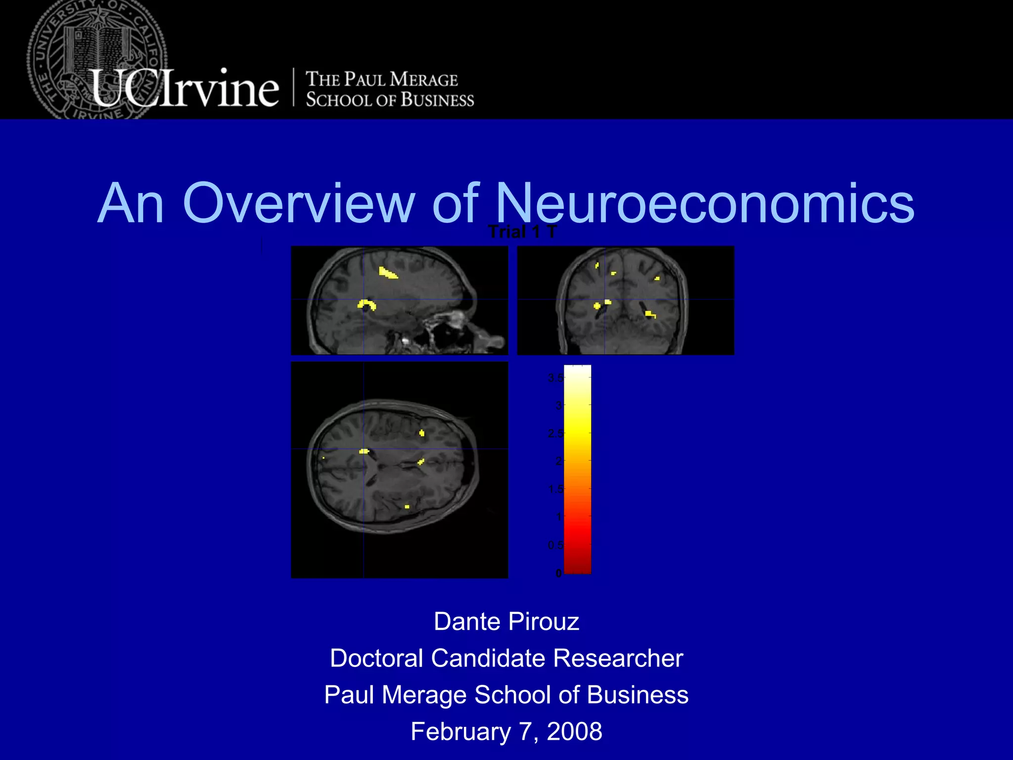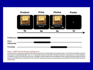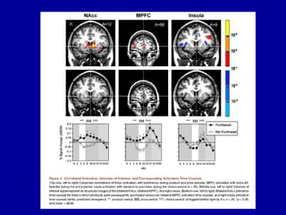 This document provides an overview of the field of neuroeconomics. It discusses how neuroeconomics integrates various disciplines like marketing, economics, psychology and neuroscience to study consumer behavior and decision making at the neural level. Some key areas covered are the influence of advertising, emotion and other people on decisions. It also summarizes various neuroscience methods like brain imaging and discusses some findings on how the brain responds to brands and advertising.
