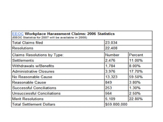 The document discusses power and empowerment in organizational behavior. It defines power as the ability to influence others to act in a desired way or make things happen. It identifies different types of position power and discusses both the positive and negative uses of power, including sexual harassment in the workplace. Sexual harassment statistics from Canada and the US are provided. Empowerment is defined as the process of helping others acquire and use power through decision making. The benefits of empowerment for organizations are higher job satisfaction, productivity, loyalty and innovation with lower turnover and absenteeism.
