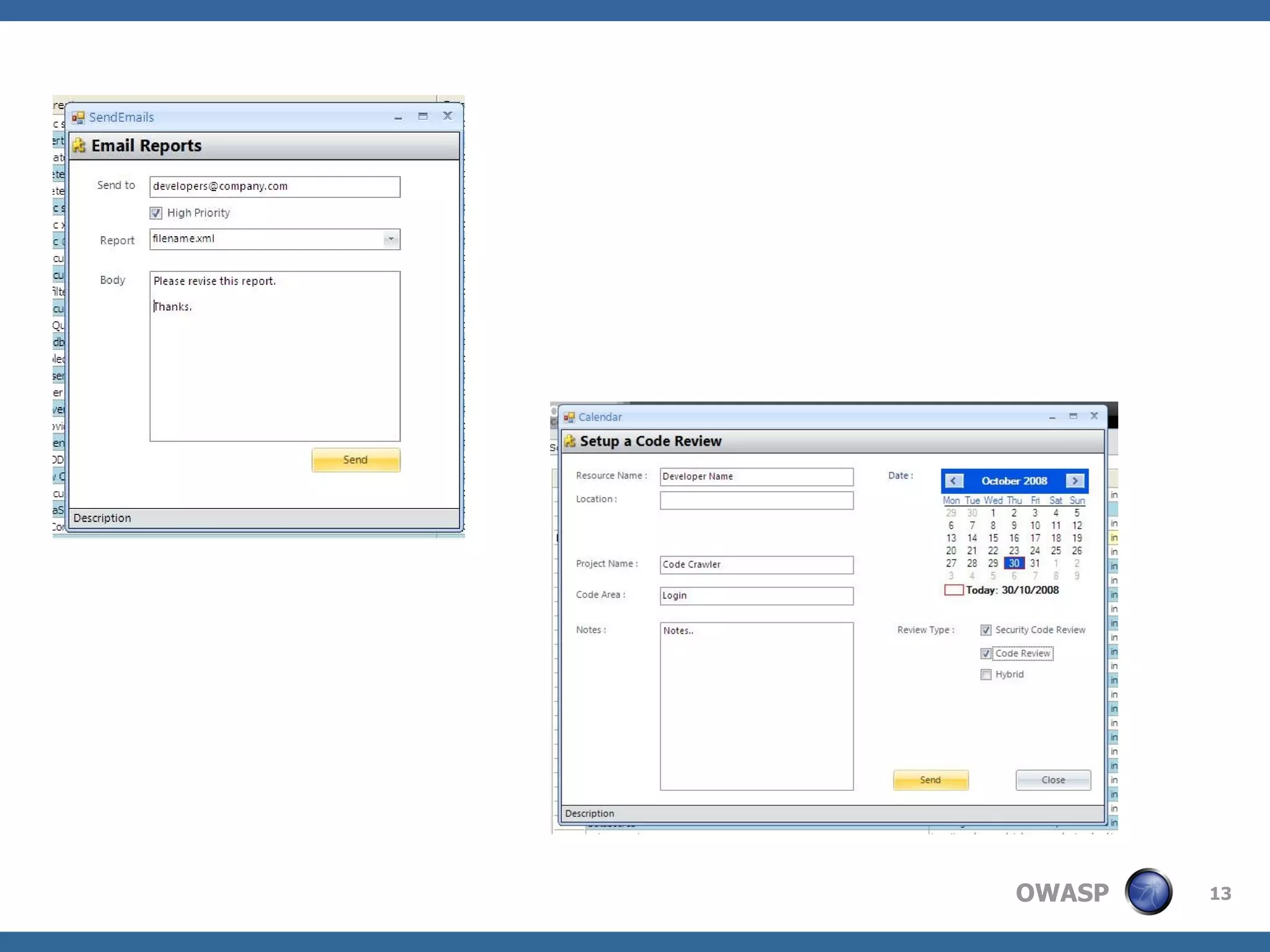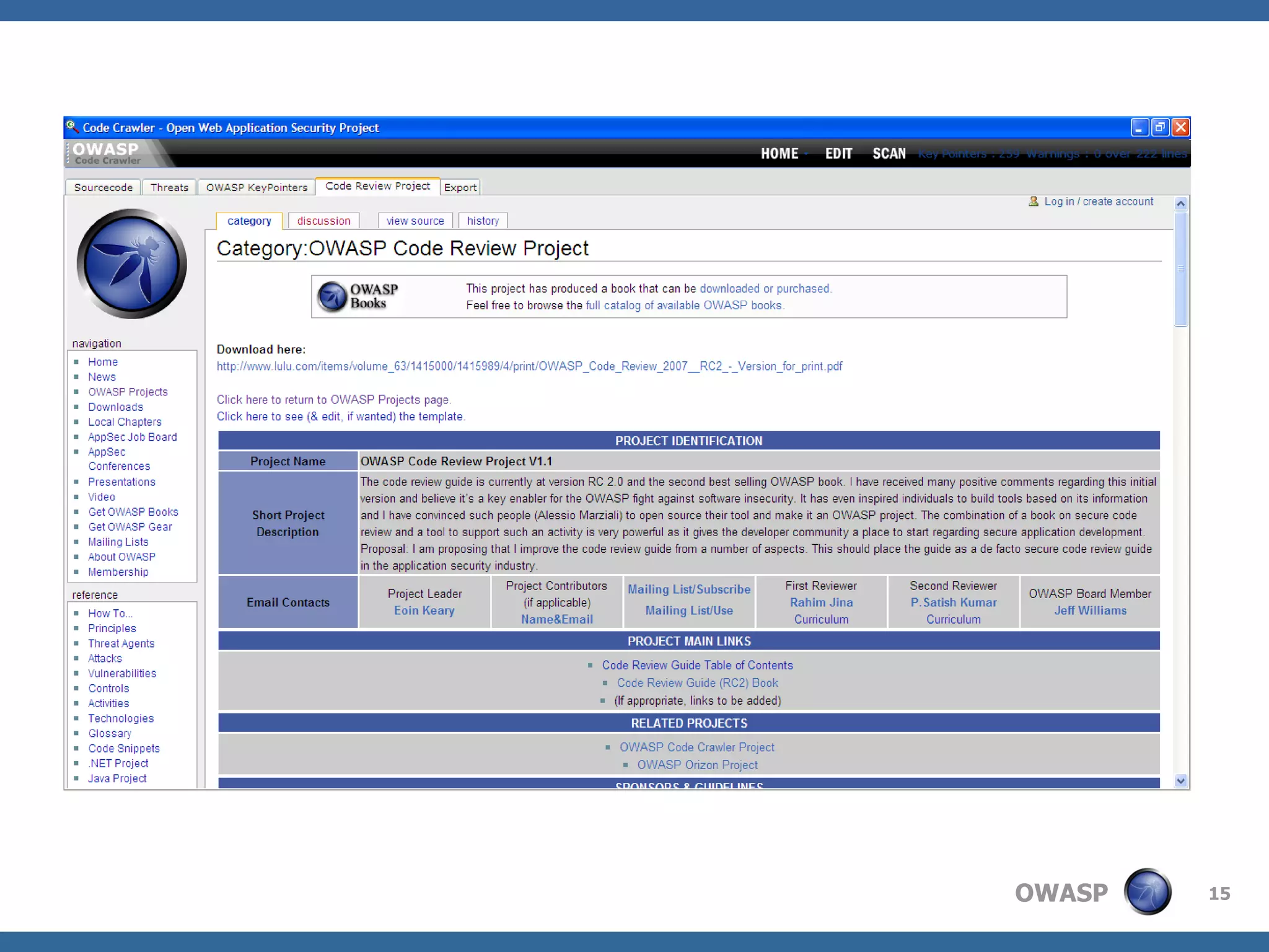 The document introduces OWASP Code Crawler, an open source tool for automated security code reviews of .NET and Java source code. It was built using C# and runs on Windows and Mono. The tool performs fast scans of source code, supports multiple languages, and generates HTML and PDF reports. It includes features like an integrated OWASP browser, email functionality, and team management capabilities. The core of the application and its functionalities are coded in a modular way using XML files for configuration and data storage. Future plans include integrating more closely with the OWASP Orizon project and keeping the code review patterns database up-to-date.