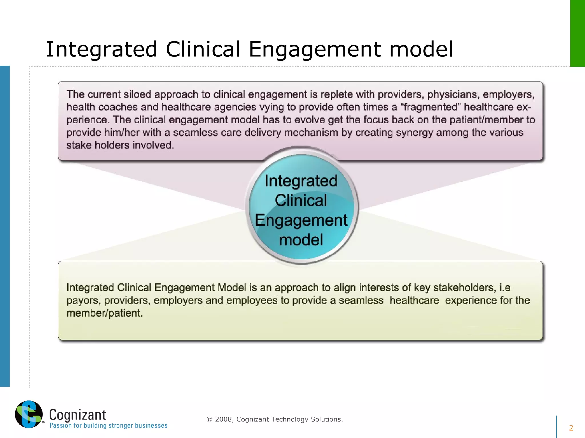 This document discusses an integrated clinical engagement model for personal health records (PHRs). It describes key drivers for this model including efforts to increase efficiency, wellness, medical management, and consumer experience. The model includes a clinical data repository that integrates various types of patient data. Challenges include a lack of standards for transferring all types of PHR data between health plans and representing elements such as alerts and physiological information. Alignment with existing standards and expanding PHR data domains are suggested for moving forward.