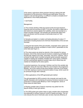 Precision farming is often misinterpreted in India and is used by agricultural institutions to obtain funding, highlighting the need for better understanding of its principles as applied in developed countries. It revolves around GPS technology, allowing for precise management of resources such as soil fertility, irrigation, and pest control to enhance agricultural efficiency. Despite significant investments in 'precision farming' projects, the actual implementation of these advanced methods remains limited among Indian farmers.