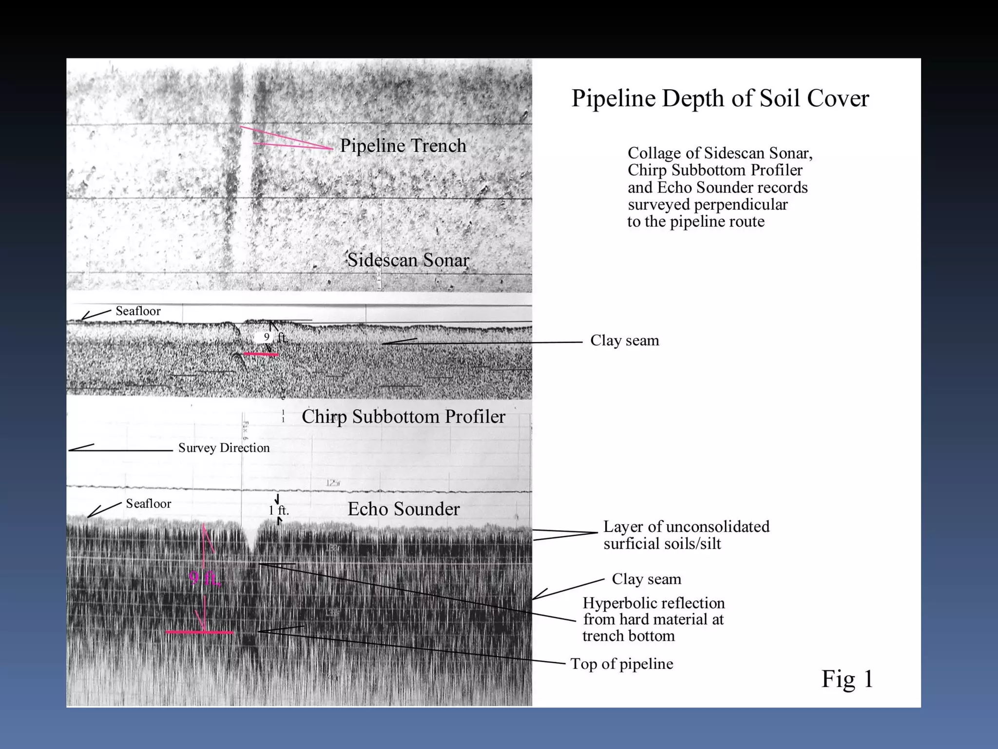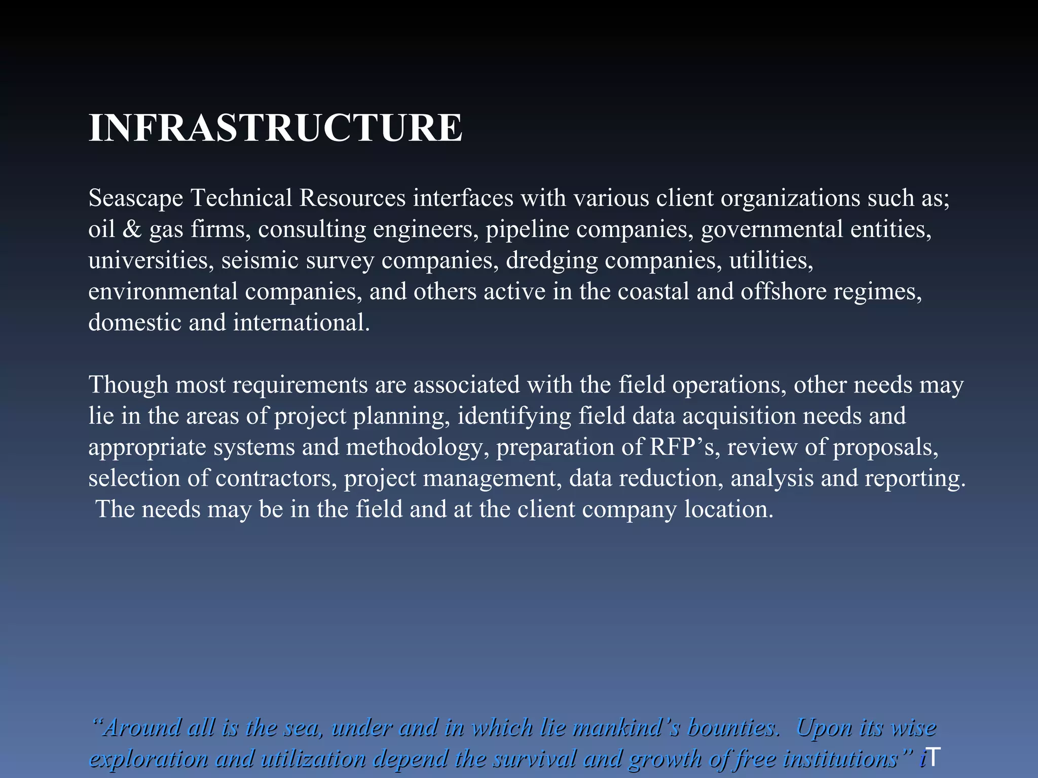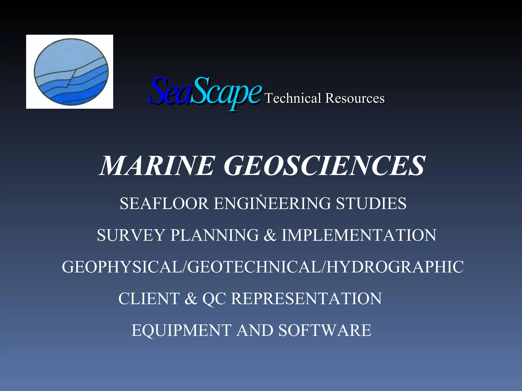 The document discusses Seascape Technical Resources, which provides marine geoscience and seafloor engineering services including multidiscipline surveys using geophysical, geotechnical and hydrographic equipment. It focuses on techniques for pipeline depth of cover surveys using subbottom profilers, echosounders, sidescan sonar, magnetometers and optionally gradiometer arrays to determine pipeline location and depth below the seafloor.