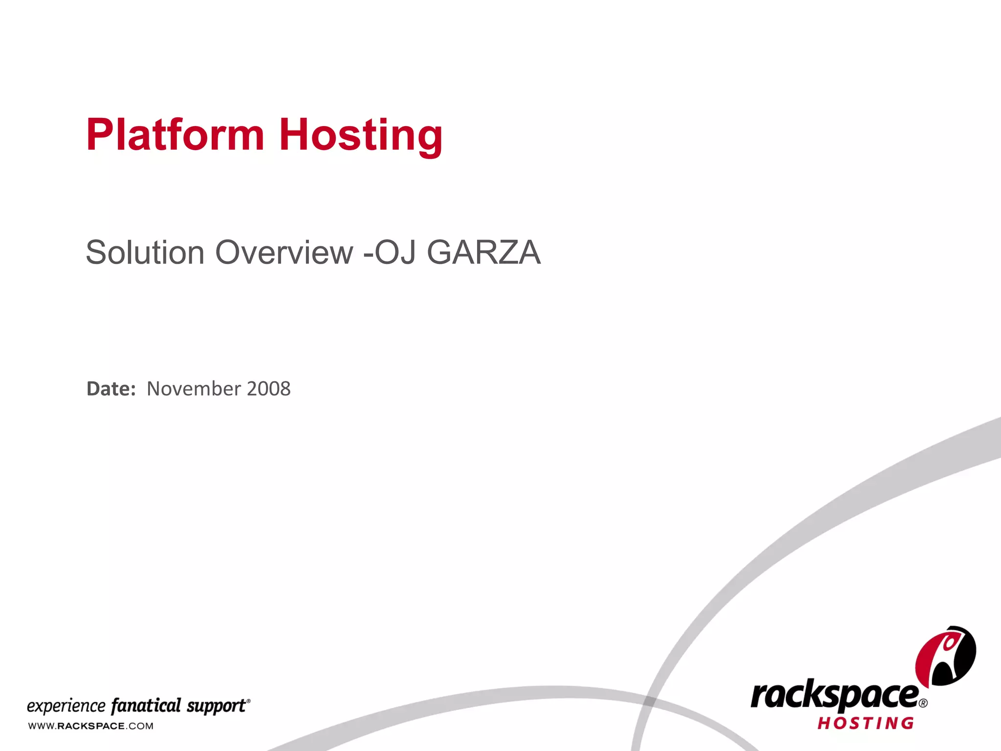 The document discusses different levels of hosting solutions including in-house, colocation, platform hosting, and managed hosting. Platform hosting bridges the gap between do-it-yourself hosting and managed hosting. With platform hosting, the provider is responsible for the physical data center, network infrastructure, and hardware while the customer manages the operating system, networking devices, monitoring, and storage. Platform hosting removes the burden of infrastructure management so customers can focus on higher value activities.