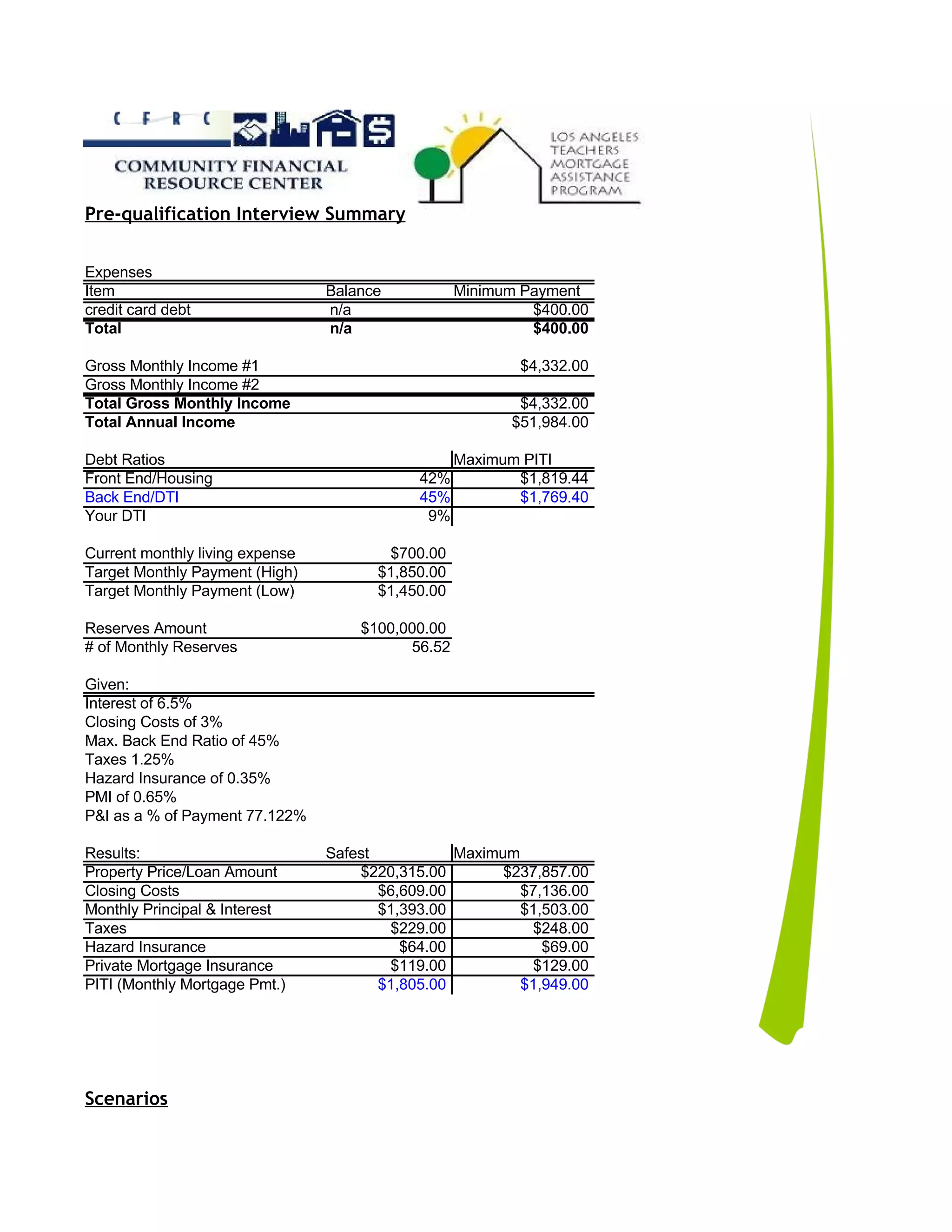 This document summarizes a pre-qualification interview for a home loan. It shows the applicant has $4,332 monthly income and $400 in credit card debt. Two potential home purchase scenarios are analyzed to see if the applicant's debt-to-income ratio qualifies them for the necessary financing. The first scenario is a $390,000 single family home, and the second is a $303,547 condo. Both scenarios explore using various down payment assistance programs to help cover closing costs and lower the applicant's monthly payment.