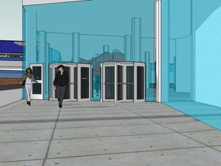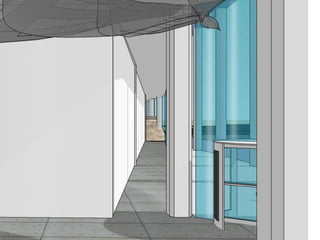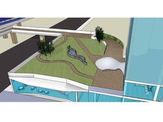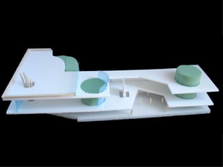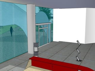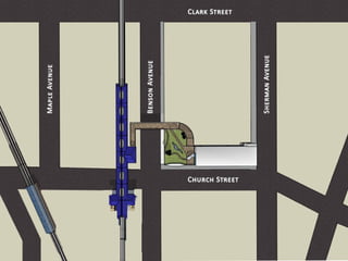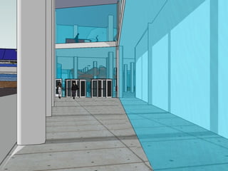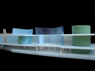 The document summarizes a thesis project proposing a new community center in Evanston, Illinois that combines civic and marketplace functions. The center aims to address issues with current decentralized marketplace models. It will be informed by principles of magnetism to guide its social and formal design. Diagrams and models show how space and circulation will work, including accommodating different uses throughout the day from commuters to students to evening visitors. Renderings depict the exterior and interior layout across three floors, connecting to transit while providing amenities like a technology center, art gallery, cafe, and rooftop garden.