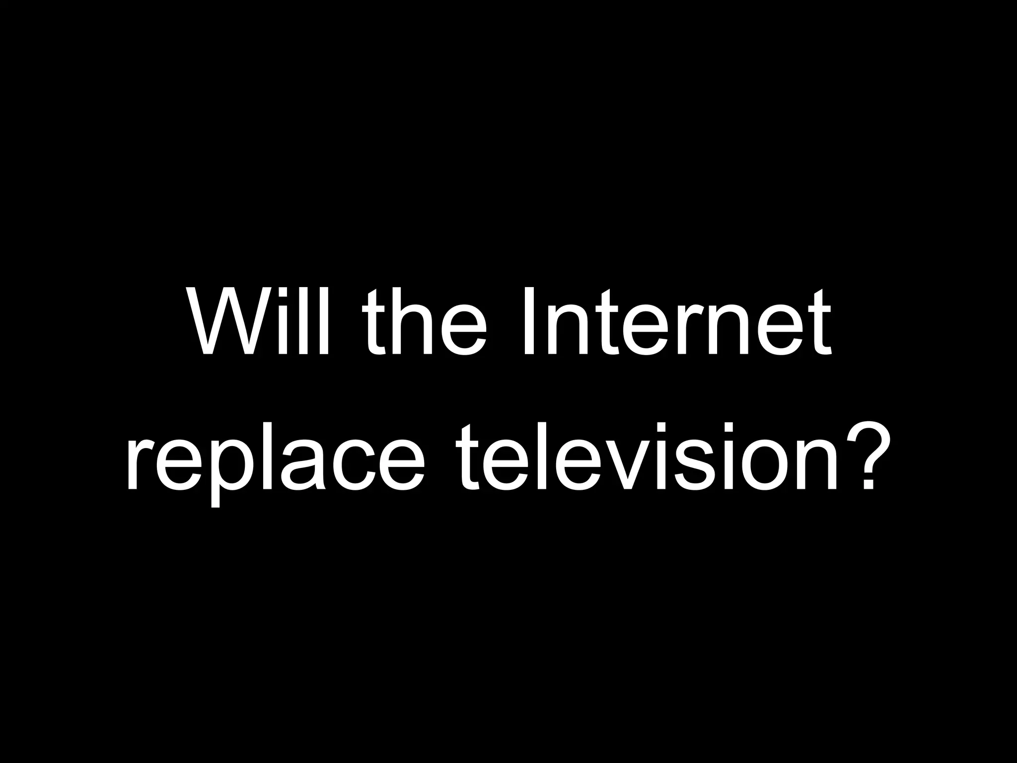 The document discusses the potential for the internet to replace television, highlighting various statistics on viewership and advertising revenue for platforms like Hulu and YouTube. It presents arguments both for and against the replacement, noting bandwidth limitations and the value of professional content versus user-generated content. Ultimately, it suggests a transition is likely within the next decade, while acknowledging the ongoing appeal and resilience of traditional television.