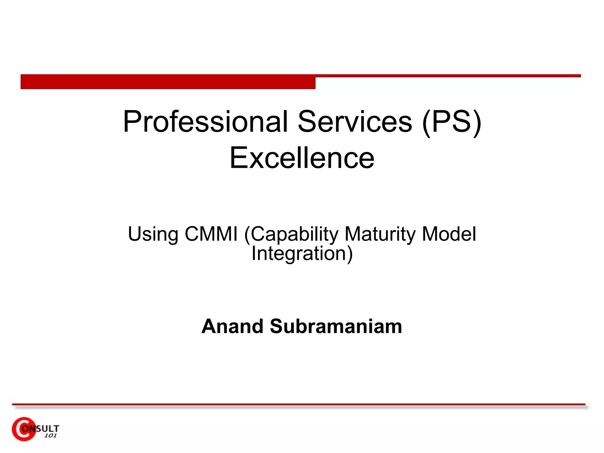 The document discusses using the Capability Maturity Model (CMM) as a roadmap to achieve professional services excellence. It outlines five service performance pillars - vision and strategy, finance and operations, human capital, alignment, and service execution. It also describes five maturity levels from initiated to optimized. The document analyzes current challenges in areas like strategy, performance, processes, customer satisfaction, and skills. It recommends developing teams to address the pillars, integrating processes and systems, creating a center of excellence, and beginning with pillars like human resources and client relationships that offer the greatest benefits.
