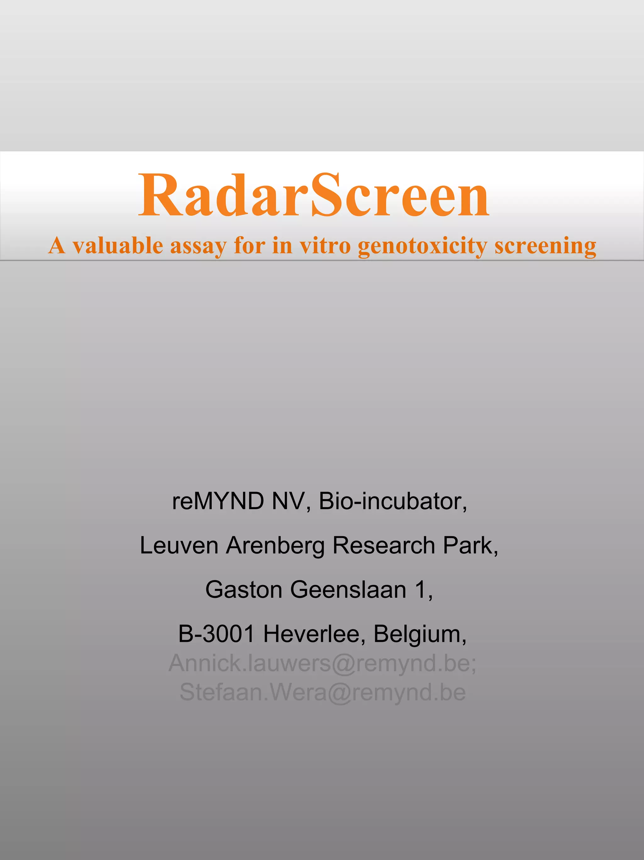 RadarScreen is an in vitro genotoxicity screening assay that uses a yeast strain with a RAD54-LacZ reporter construct to detect agents that affect genomic DNA integrity. Compounds are supplied to yeast cells in microplates in the presence or absence of hepatic enzymes, allowing detection of reactive metabolites. Reporter activity is measured by luminescence within 8 hours. The assay has proven sensitive (80%) and specific (77%) for detecting clastogenic and aneuploidy compounds. Combining it with another test leads to 96% sensitivity for mutagenicity and 84% for genotoxicity. RadarScreen is a high-throughput, cost-effective, and user-friendly method to identify genotoxic liabilities