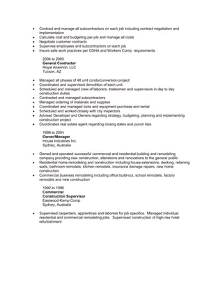 John House is a project manager for Barnhill Contracting in Raleigh, NC with over 20 years of experience in construction management, general contracting, and owning his own residential and commercial construction businesses in Australia and Arizona. He has managed a variety of projects including renovations, new construction, and subdivision development. He holds general contractor licenses in Arizona and construction certifications from Australia.