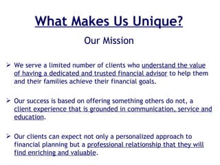 3) The document outlines common investor mistakes and emphasizes the importance of written goals, financial planning, and ongoing communication between clients and the firm.
