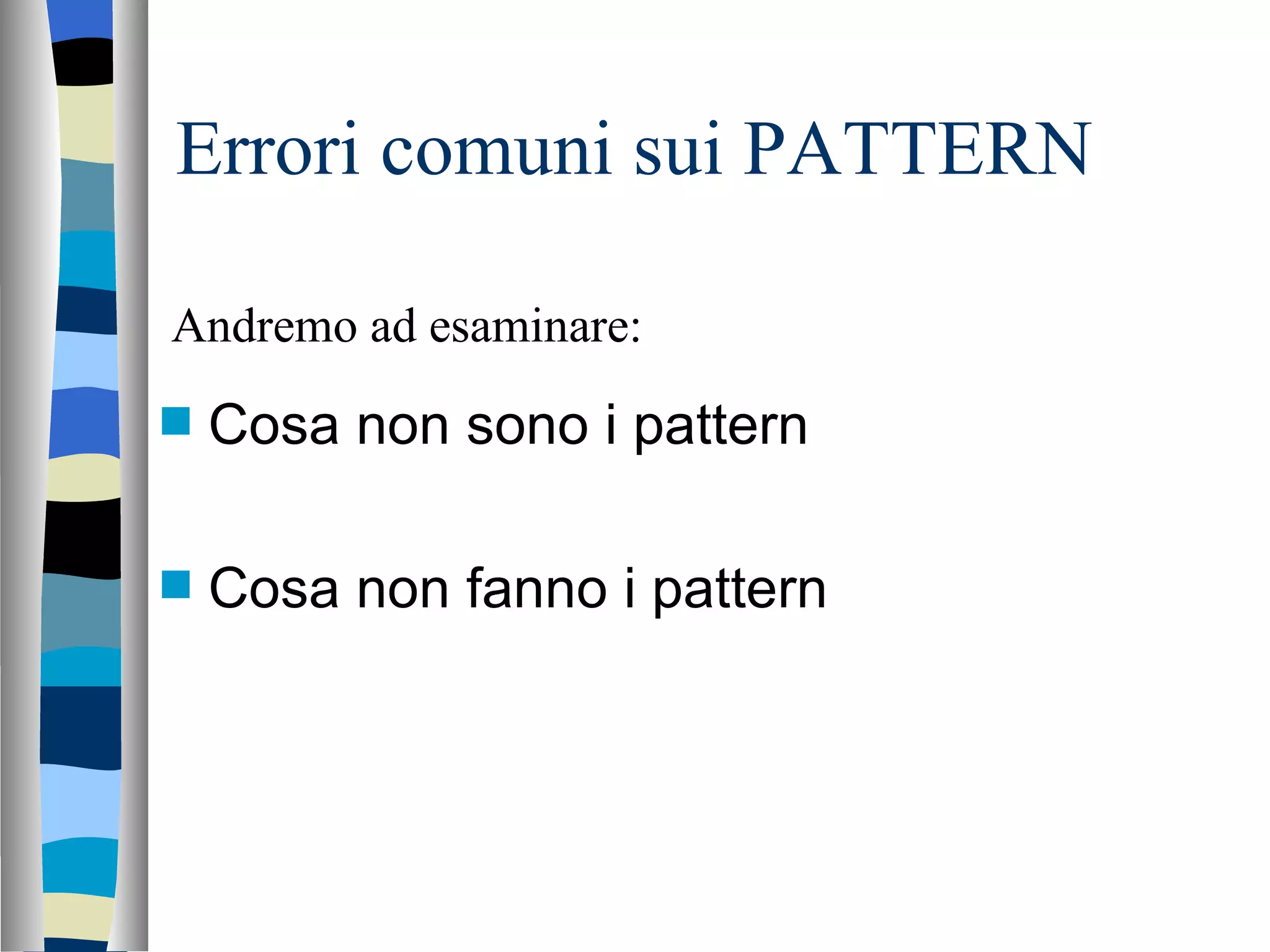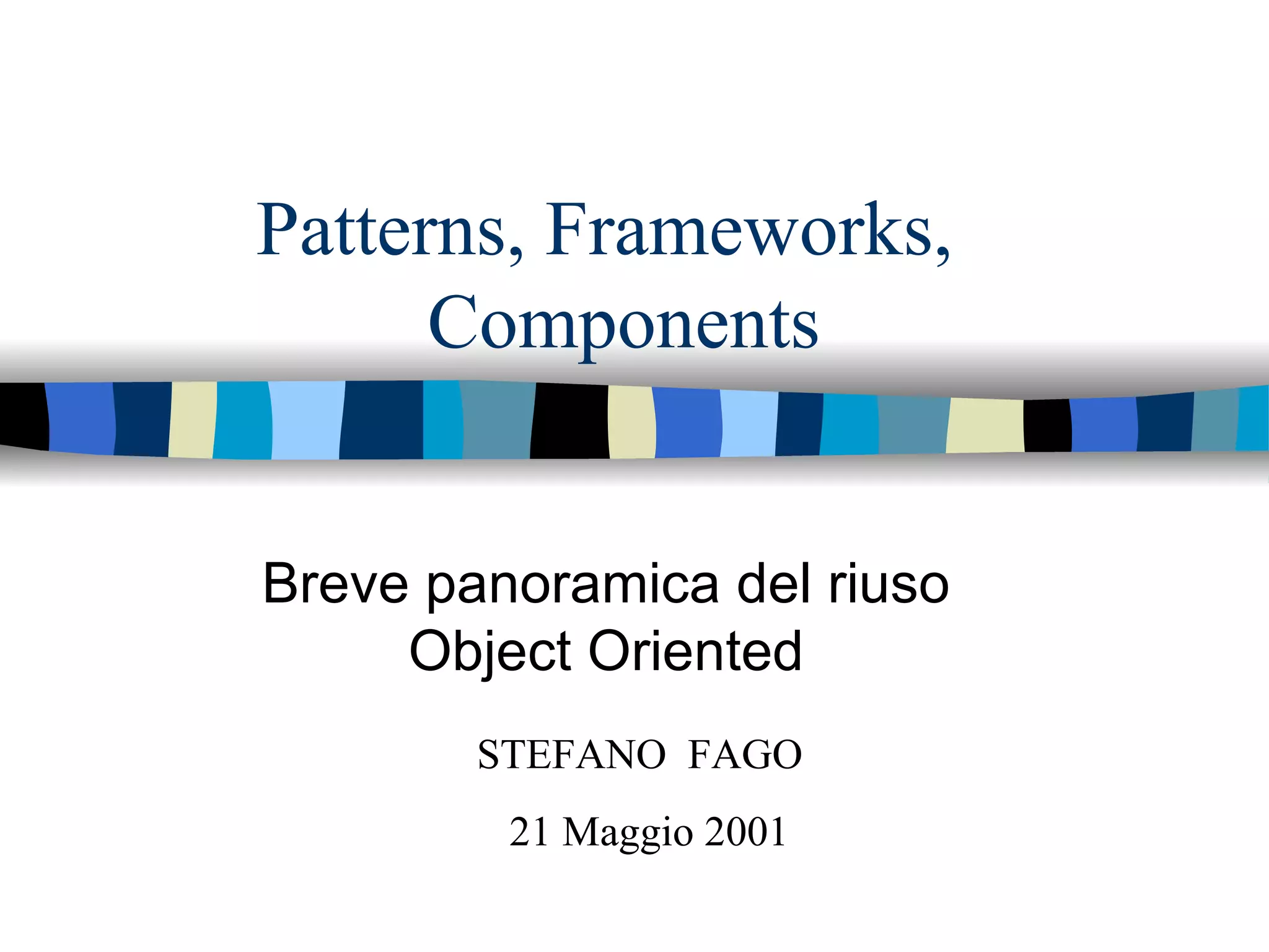 Il documento analizza i pattern e i framework nel contesto del riuso object-oriented, evidenziando errori comuni sulla natura dei pattern e le loro funzionalità. I pattern sono definiti come strumenti concettuali per la risoluzione di problemi ricorrenti e non possono garantirne automaticamente la riusabilità o produttività. Viene anche discusso il concetto di framework come progetto riusabile che integra classi astratte e facilita sia il riuso del codice che del design.