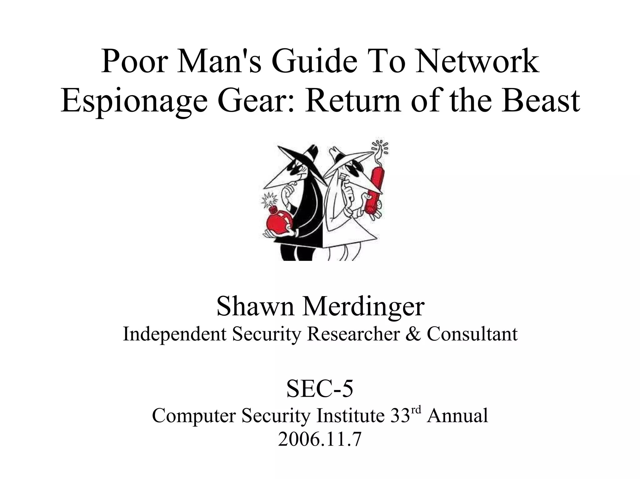 This document summarizes a presentation about low-cost devices that can be used for network espionage. It describes various small, inexpensive devices like wireless routers and PDAs that have been modified to perform attacks and surveillance through their networking capabilities. Examples like the Linksys WRT54G wireless router and Nokia 770 PDA are provided. The presentation outlines how these network espionage devices (NEDs) work, potential attacks they enable, and recommendations for security countermeasures.