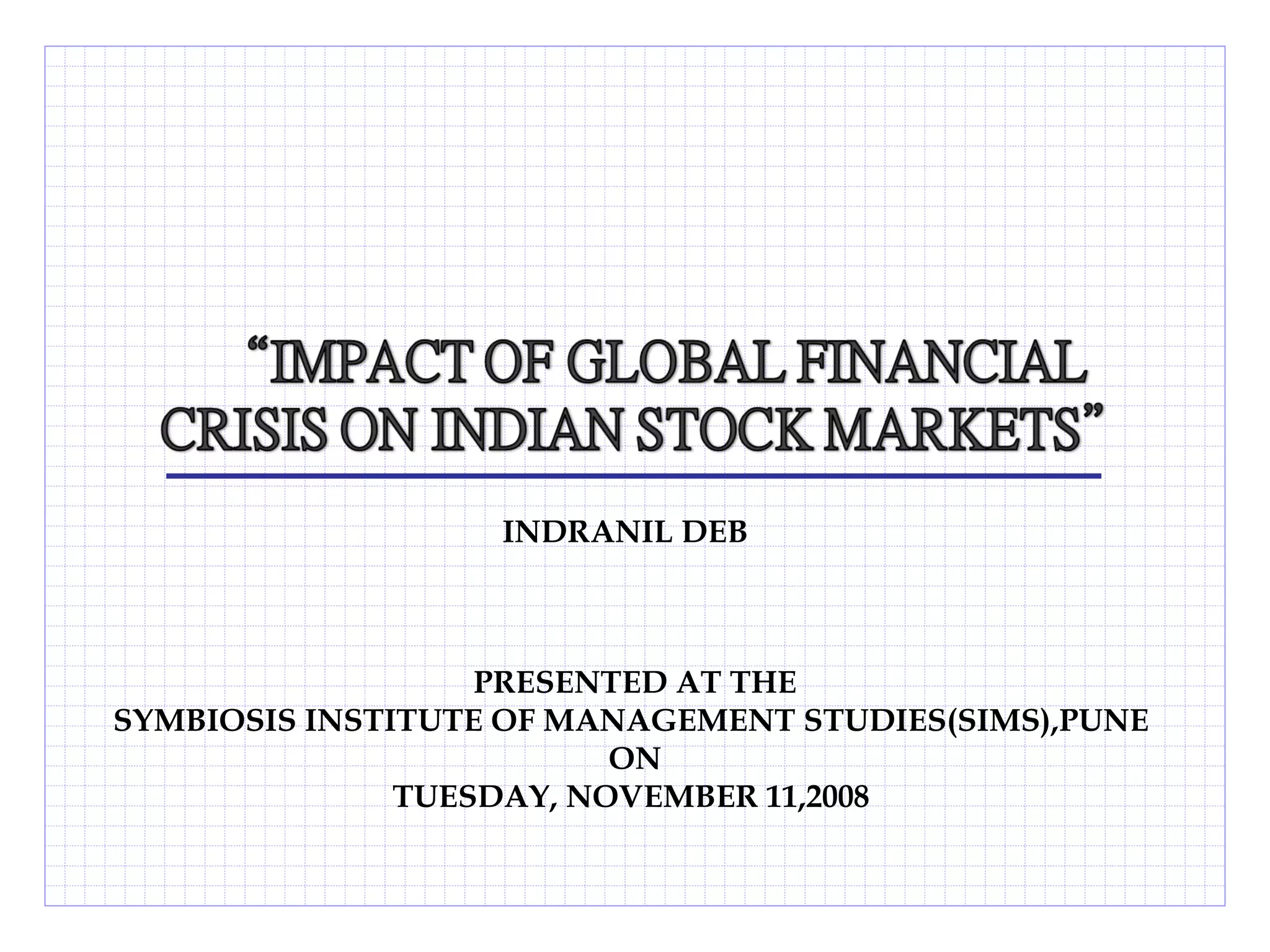 Indranil Deb presented at the Symbiosis Institute of Management Studies on November 11, 2008. The presentation covered several topics related to the global financial crisis including the growth of global financial assets from $12 trillion in 1980 to $118 trillion in 2003, the shift away from banks towards market institutions, and the impact of the US subprime crisis which began surfacing in 2007. Effects of the crisis included losses totaling over $512 billion, the bankruptcy of Lehman Brothers, and declines in global stock markets and currencies from late 2007 through 2008.