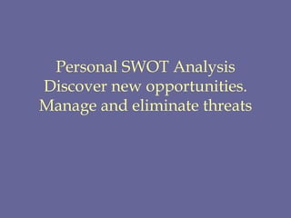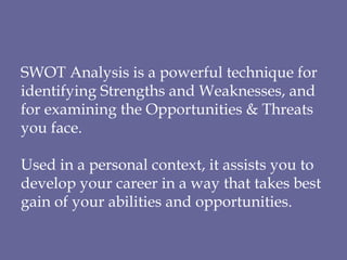 A SWOT analysis involves identifying your strengths, weaknesses, opportunities, and threats in both personal and business contexts. For personal SWOT analysis, it helps you recognize your advantages and areas for improvement to develop your career. For business, it allows you to differentiate yourself from competitors by leveraging your strengths while also identifying external factors to capitalize on or mitigate risks. The document provides examples and guidance on assessing each SWOT element to gain insight and inform planning.
