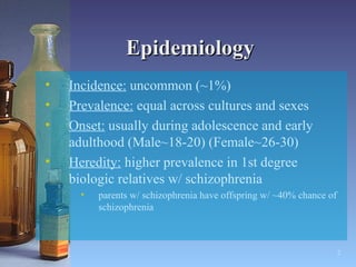 This document summarizes the diagnosis and pharmacotherapy of schizophrenia. It discusses the epidemiology, diagnostic criteria, core symptom clusters, prognostic factors, and monitoring of typical and atypical antipsychotic medications used to treat schizophrenia. Side effects and drug interactions of first and second generation antipsychotics are also reviewed.