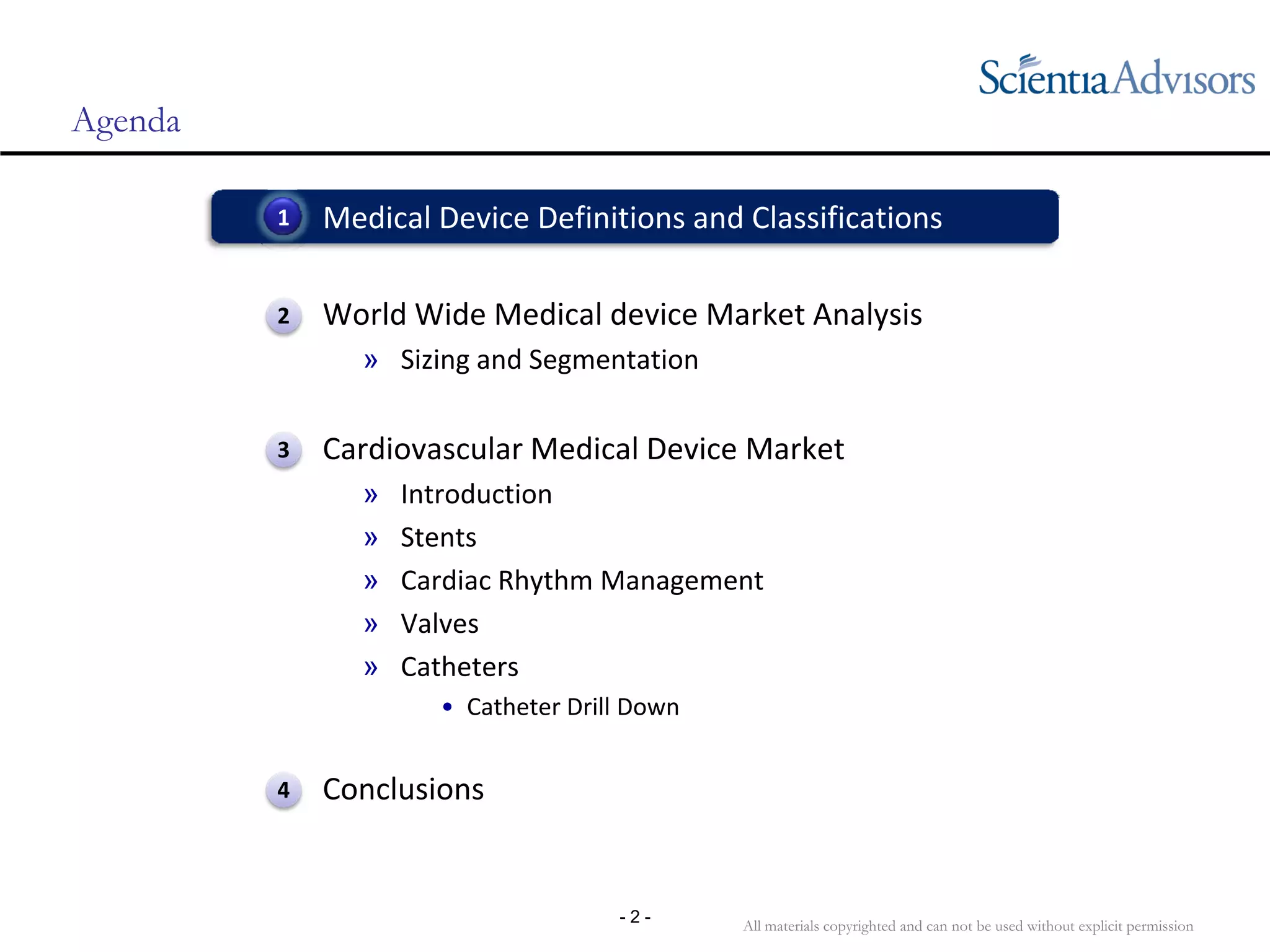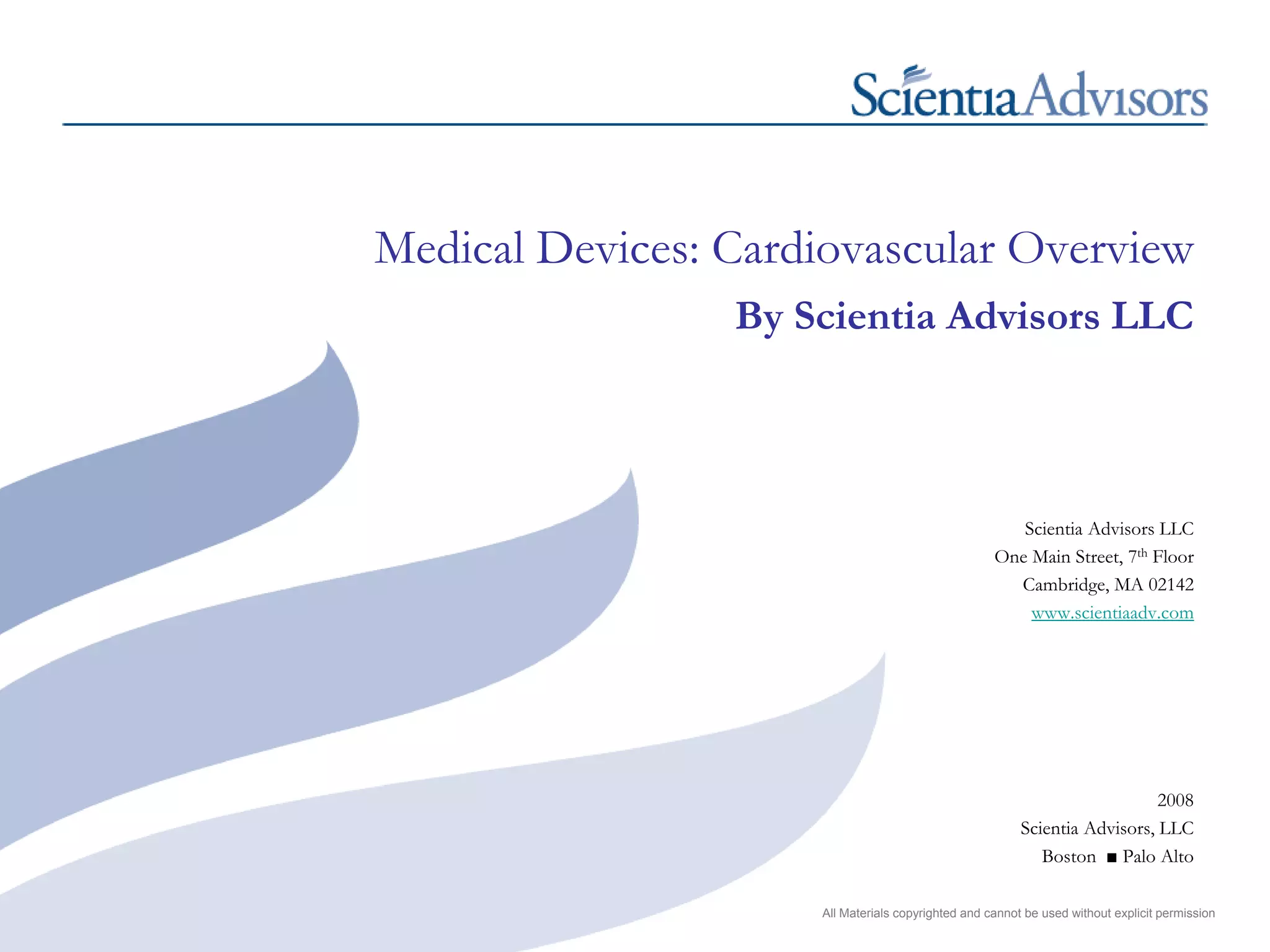 The document provides an overview of the cardiovascular medical device market. It discusses definitions and classifications of medical devices, the worldwide medical device market analysis including sizing and segmentation, and focuses on key cardiovascular device segments - stents, cardiac rhythm management, valves, and catheters. The cardiovascular device market is large and growing, driven by an aging population and the increasing prevalence of cardiovascular disease globally. Major players operate in traditional segments like stents and cardiac rhythm management, while emerging markets provide new opportunities for growth.