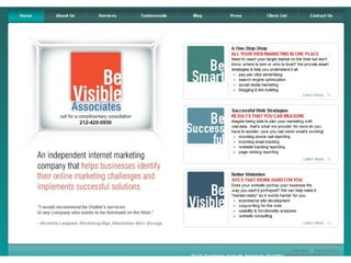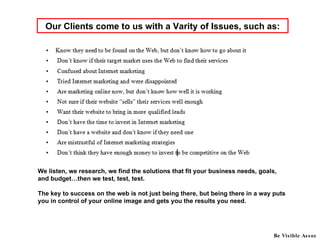The document discusses various digital marketing strategies that a company called Be Visible Associates provides to help businesses increase their online visibility and get better search engine rankings. These include search engine optimization, pay-per-click advertising, social media marketing, blogging, and website usability consulting. Be Visible Associates handles all aspects of implementing these strategies for clients and provides reporting on key metrics like website traffic and leads generated.