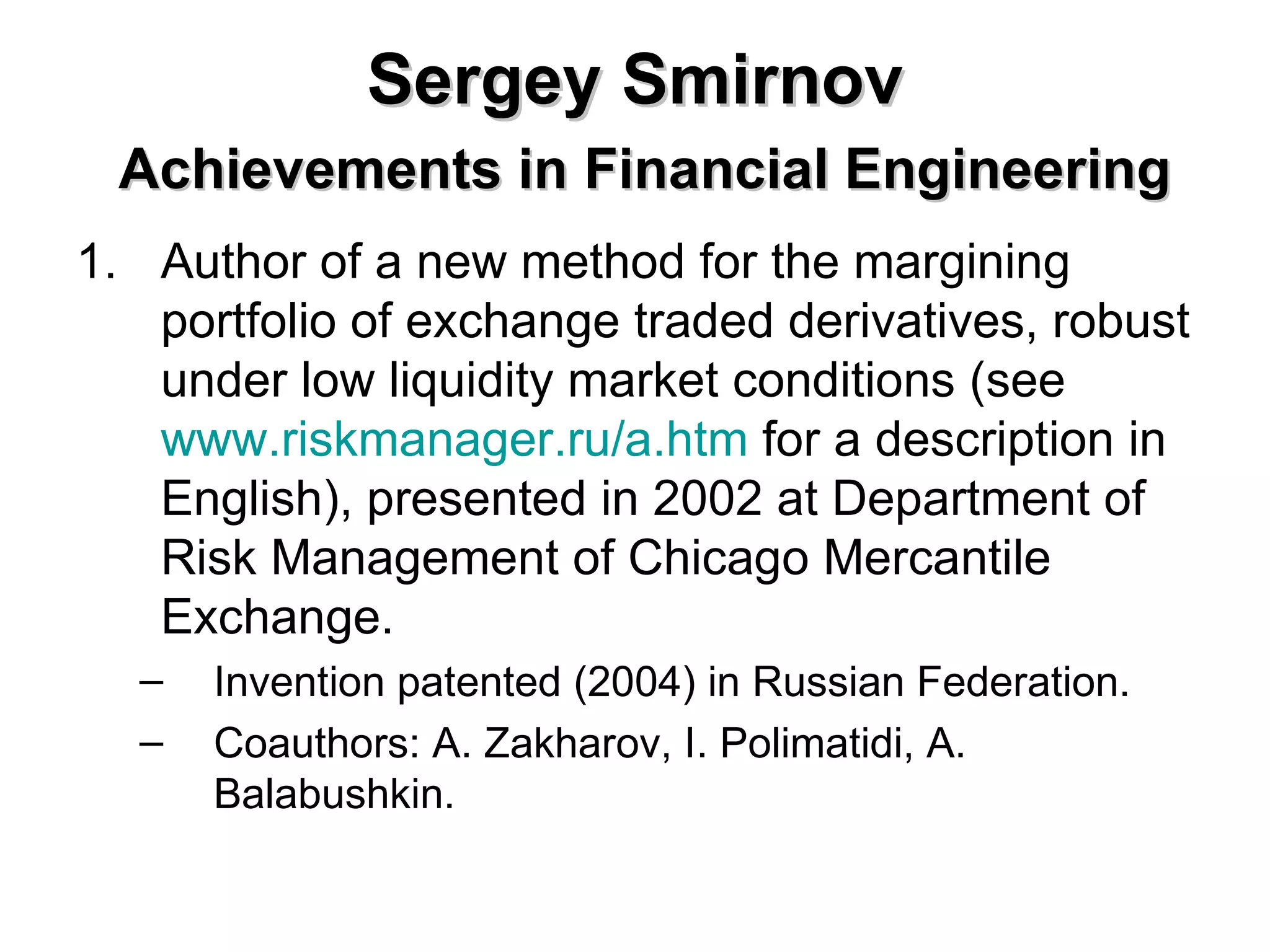 Sergey Smirnov has made several achievements in financial engineering: