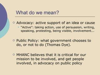 The document outlines the importance of advocacy and public policy in the context of mental health, emphasizing the role of the Mental Health Advocacy Network (MHANC) in promoting support for individuals with mental illness and their families. It discusses the values that guide MHANC, such as inclusiveness, access to treatments, and full participation in society, while detailing the organization's activities, including coalition building, lobbying, and community training. Overall, MHANC aims to influence policy decisions to align with their values and improve mental health resources and services.