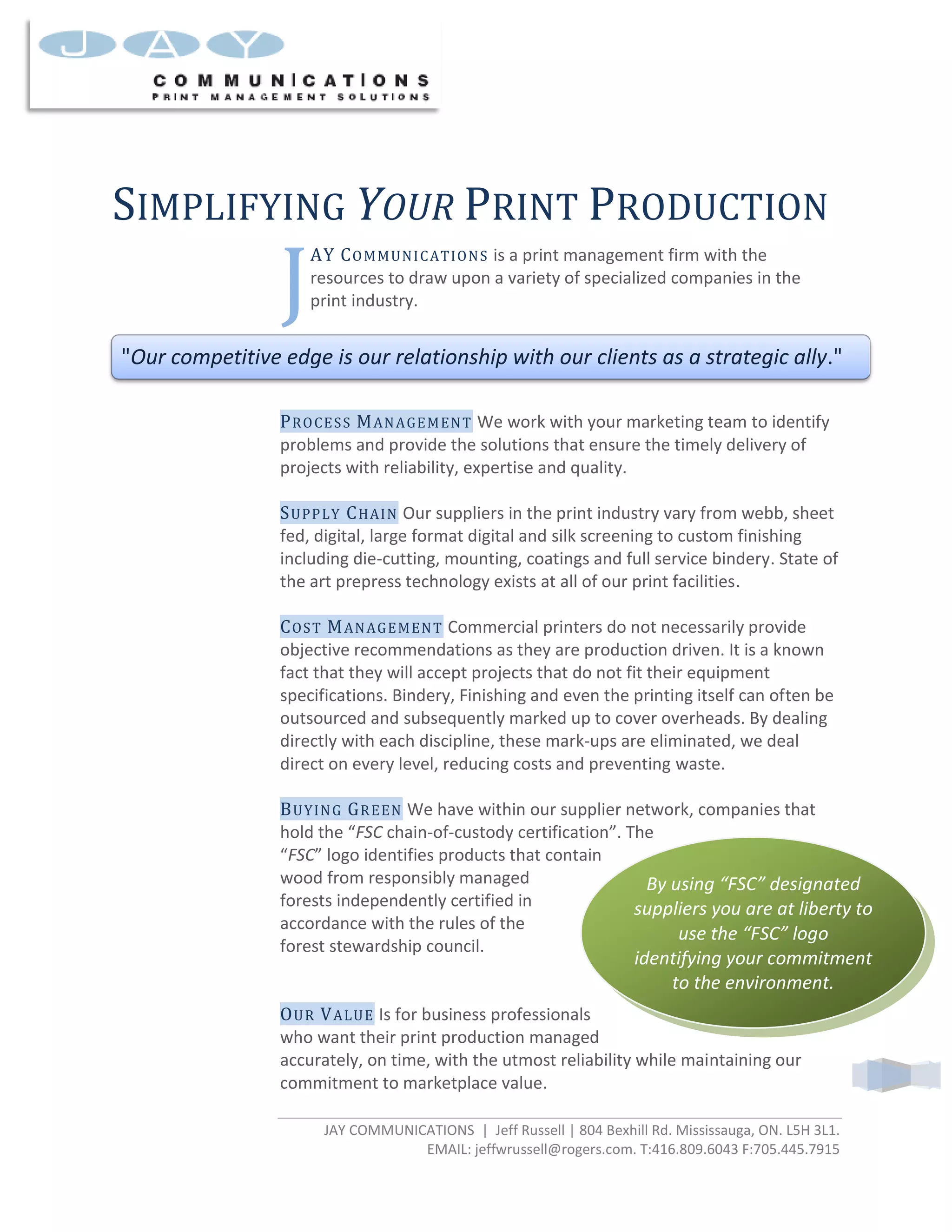 Jay Communications is a print management firm that works with clients to identify problems and provide solutions to ensure timely and reliable print production. They have relationships with suppliers across various print disciplines like web, sheet fed, digital and large format printing as well as finishing services. By dealing directly with suppliers and outsourcing where possible, they are able to reduce costs and prevent waste for clients. They also have suppliers that are certified as environmentally responsible by the Forest Stewardship Council.
