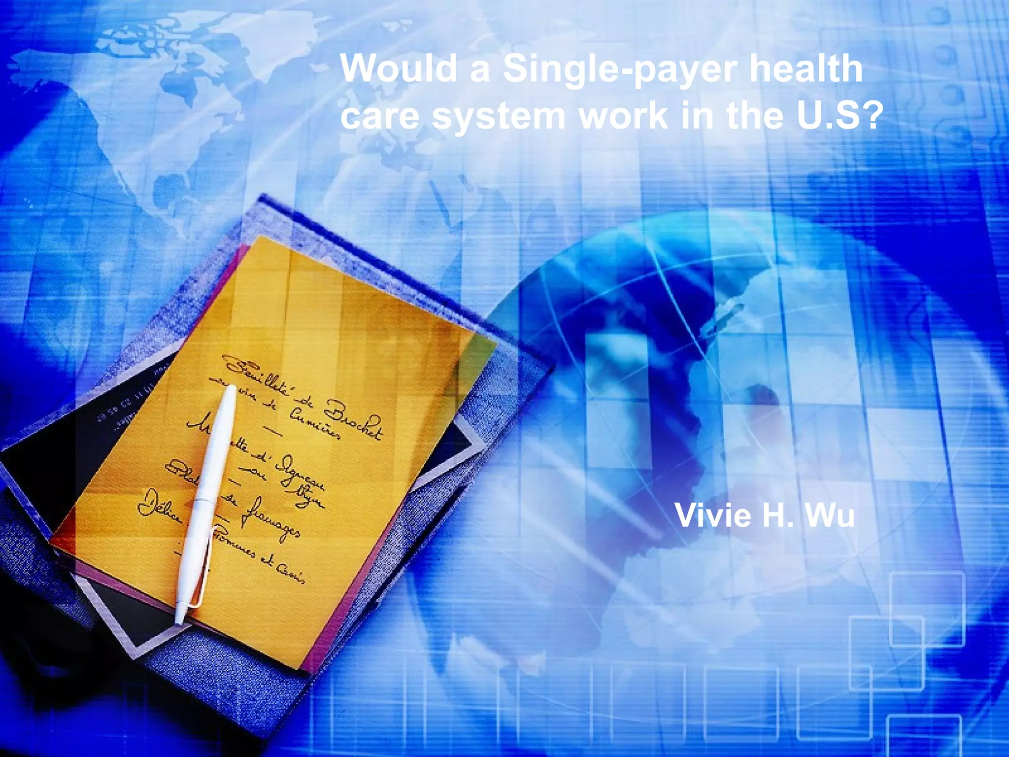 The document discusses single-payer healthcare systems and whether one could work in the U.S. It defines single-payer as a healthcare financing system with one source of money for providers. Examples given include Medicare and some country-wide systems. Pros listed are potential savings on administration costs and universal coverage. Cons discussed include the potential for government mispricing and significant changes required. Polls show most Americans favor reform but are split on solutions and tax increases. Overall the conclusion is that a single-payer system could increase access but faces strong political opposition and transition challenges.