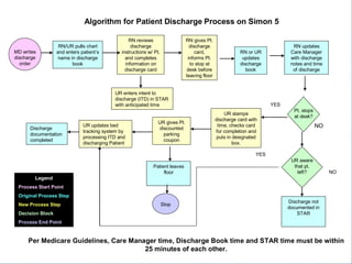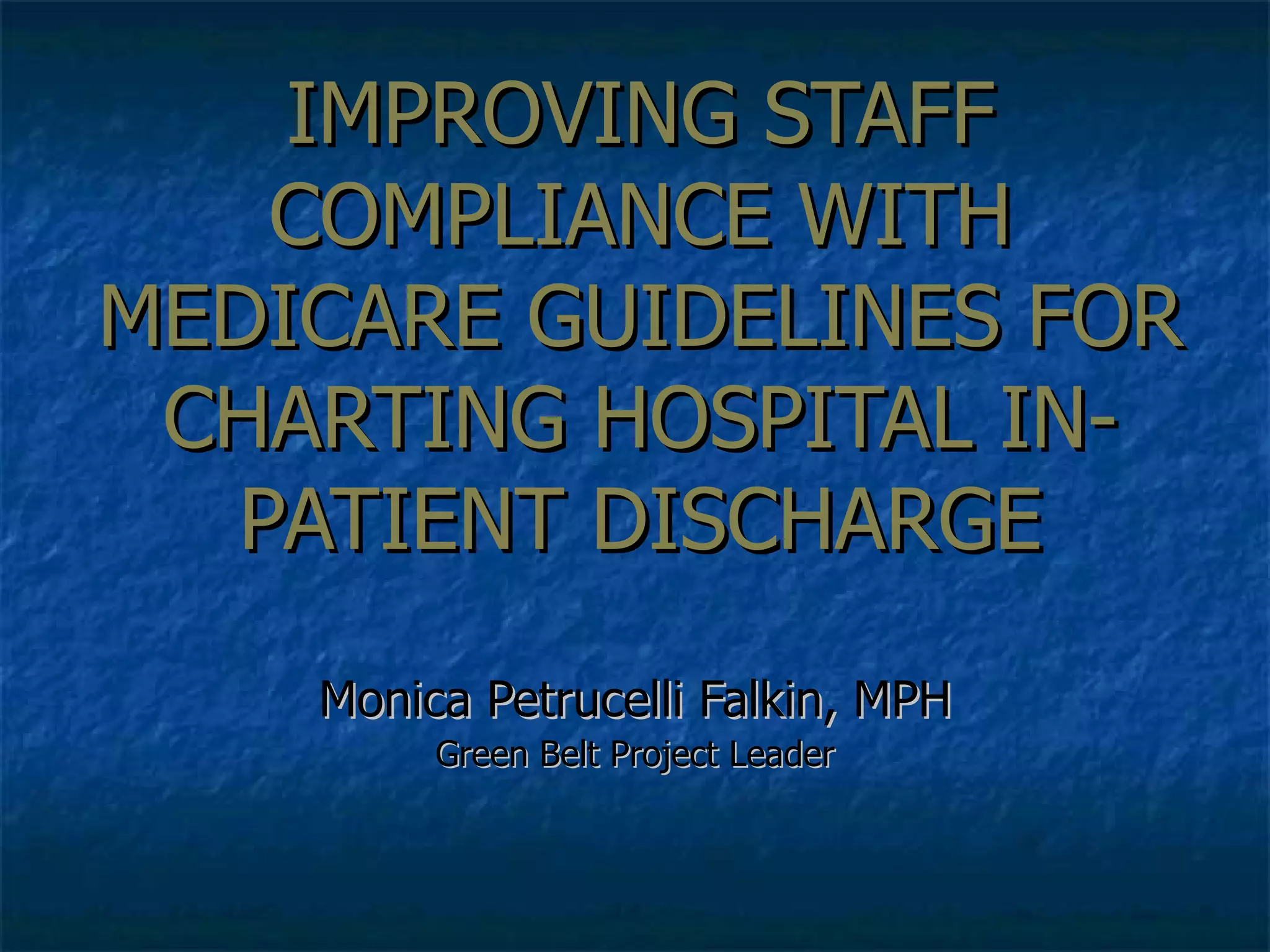 The document discusses improving staff compliance with Medicare guidelines for charting patient discharges at a hospital. It analyzes the current discharge documentation process, finds deficiencies, implements solutions such as discharge education and tracking systems, and re-measures improvements. Process errors were reduced by over 50% and statistical tests showed the improved process was in control and significantly better than before.