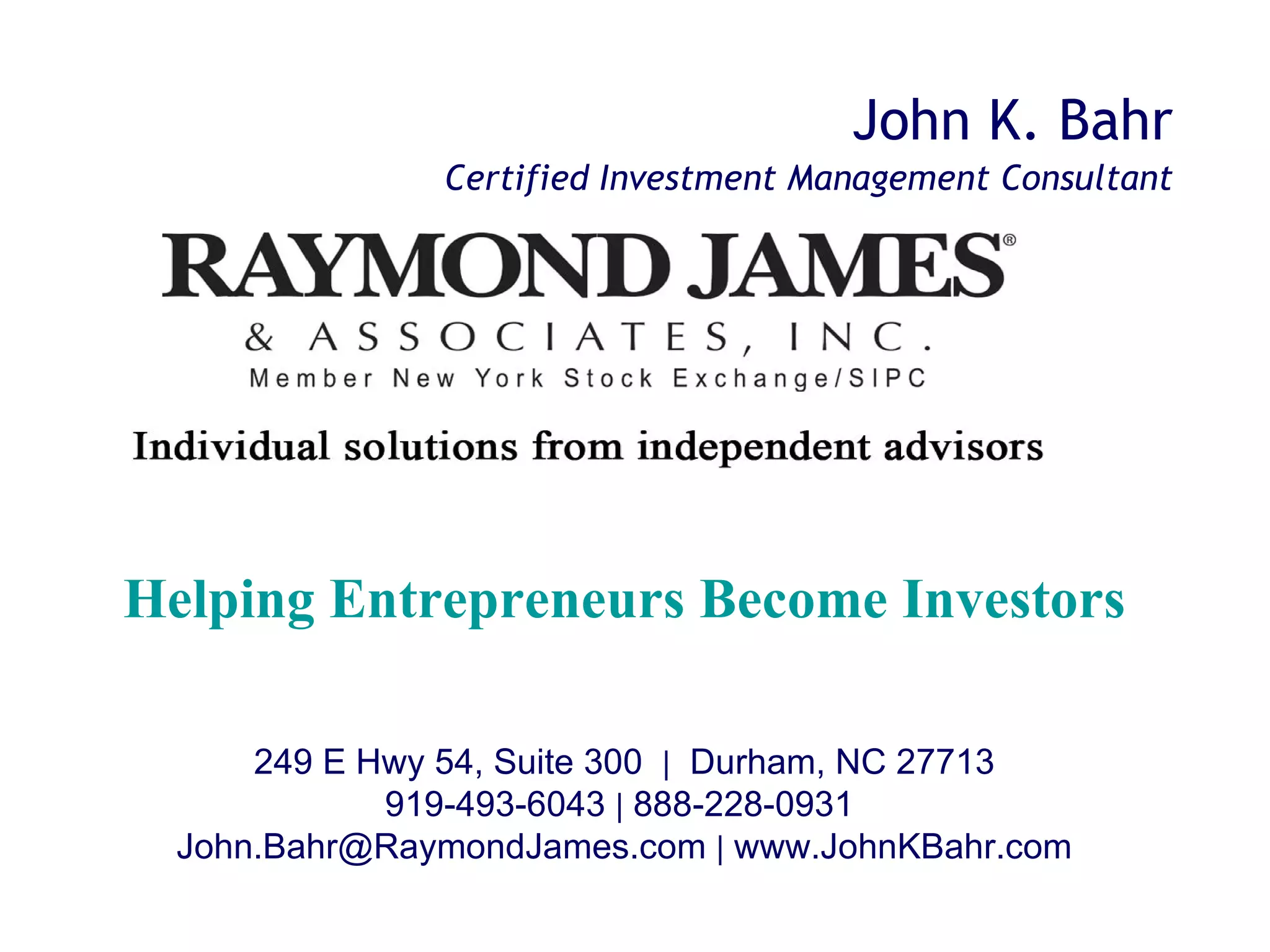 John K. Bahr and his team at Raymond James provide financial consulting services to business owners and entrepreneurs. Their services include business succession planning, retirement planning, and developing customized investment strategies. They take a personalized approach and conduct in-depth analysis to help clients achieve their financial goals and build confidence in their plans. Their process focuses on understanding client priorities, creating investment policies, and maintaining open communication.