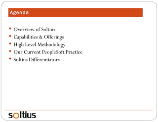 This document provides an overview of Soltius, an IT consulting and outsourcing company. It details Soltius' capabilities and offerings related to PeopleSoft, including implementation, support, and staff augmentation services. It also describes Soltius' global delivery network, methodology, and current PeopleSoft practice with clients in various industries.