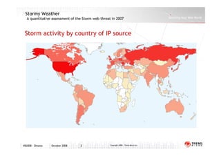 This document analyzes the Storm botnet threat in 2007. It describes how Storm infects computers through malicious email attachments and website visits, turning the computers into remotely controlled "botnets". The botnets are then rented out to generate spam emails and launch denial-of-service attacks. Storm also sells personal data mined from infected computers. To avoid detection, Storm uses rootkits, regular code updates, and techniques like decentralized control and frequent code replacement. The document lists several Storm outbreaks in 2007 and includes graphs showing spam volume and the country of origin for Storm-infected IP addresses.
