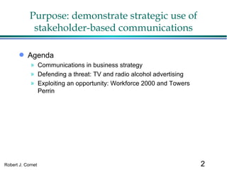 The document discusses the strategic use of stakeholder-based communications in business through two case studies involving broadcasting and Towers Perrin. It highlights how organizations can manage relationships with stakeholders to defend against threats, such as advertising bans, and exploit opportunities, like workforce 2000. The cases illustrate the importance of redefining issues and actions to create effective communication strategies that enhance organizational success.