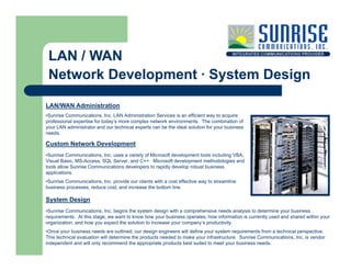 Sunrise Communications, Inc. specializes in professional installation and management of voice and data telecommunications systems for various infrastructures, offering services such as network development, structured cabling, and wireless design. Established in 2001, the company has built a reputation for quality and efficient service, ensuring that clients are equipped for current and future telecommunications needs. Their expertise extends to a range of industries including medical, educational, and retail sectors, providing tailored solutions to enhance operational efficiency.