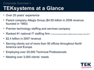 TEKsystems is a leading technology staffing and services company with over 20 years of experience. It has over $2.4 billion in annual revenue and employs over 20,000 technical professionals serving over 3,000 clients. TEKsystems specializes in applications, infrastructure, communications, financial services, government, healthcare, and IT. It provides staffing, team, component, and workforce management services to customize solutions for its customers.