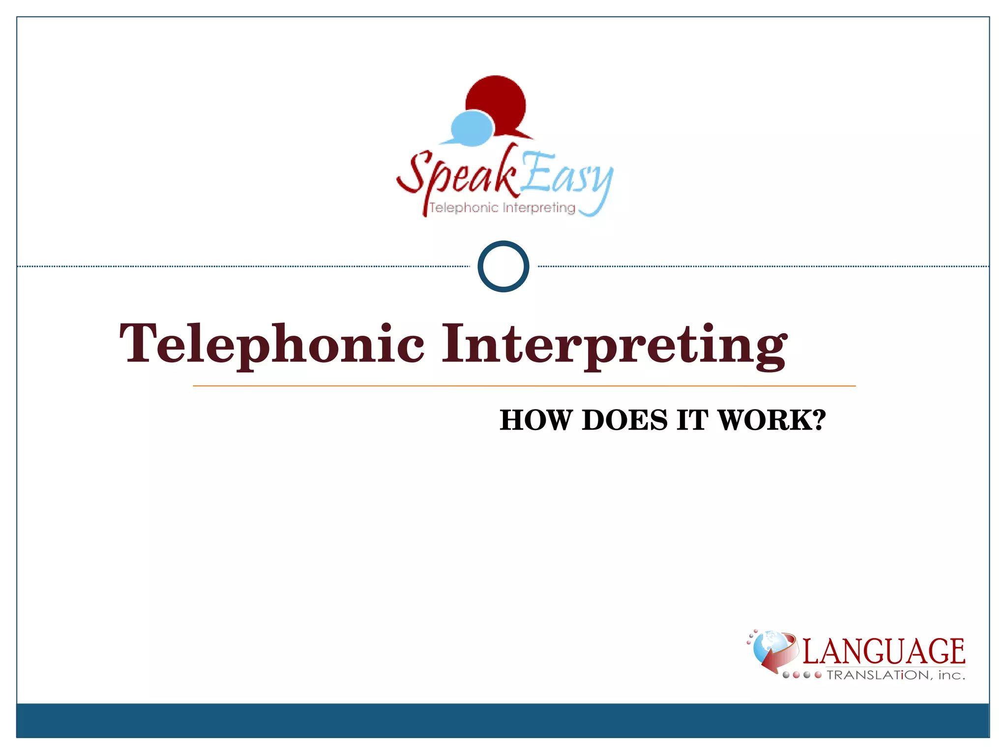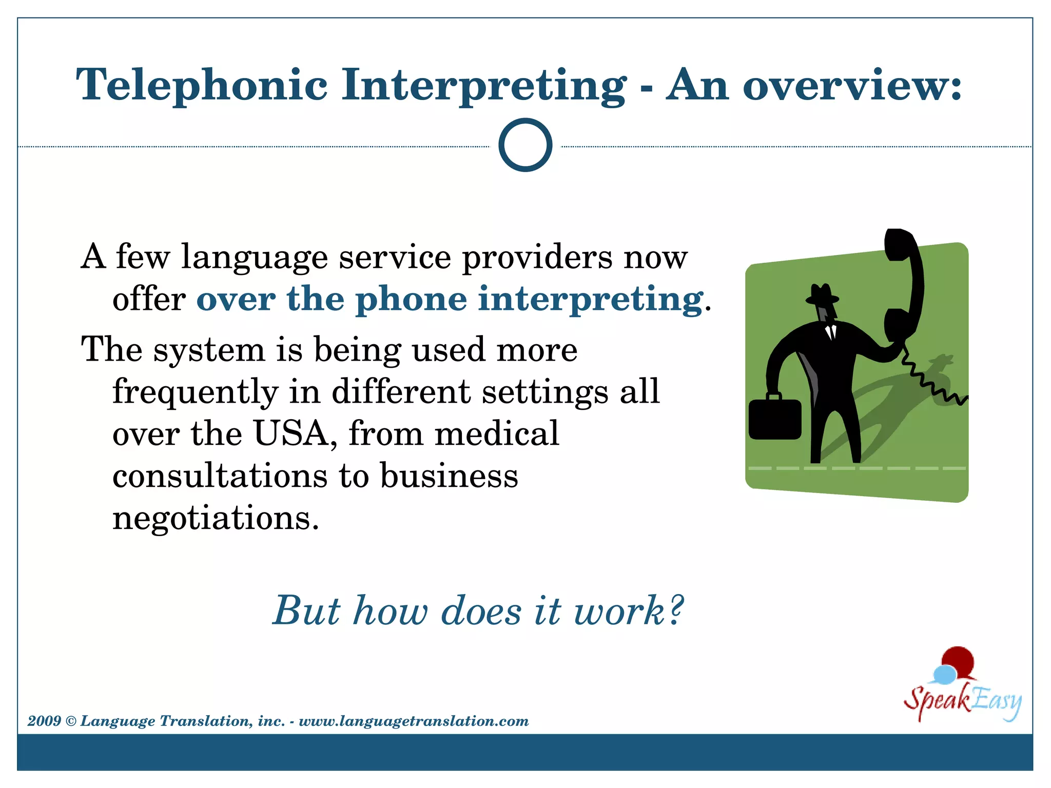 Telephonic interpreting provides interpretation services over the phone between individuals who do not speak the same language. It works through remote simultaneous or consecutive interpreting technology which allows an interpreter to communicate in real-time from a remote location via phone. Effective telephonic interpreting requires skilled interpreters with language proficiency, subject expertise, and the ability to manage technical issues that may arise from communicating remotely over the phone. While it has advantages like low cost and quick access to interpreters, telephonic interpreting also has limitations compared to in-person interpretation like inability to see body language.